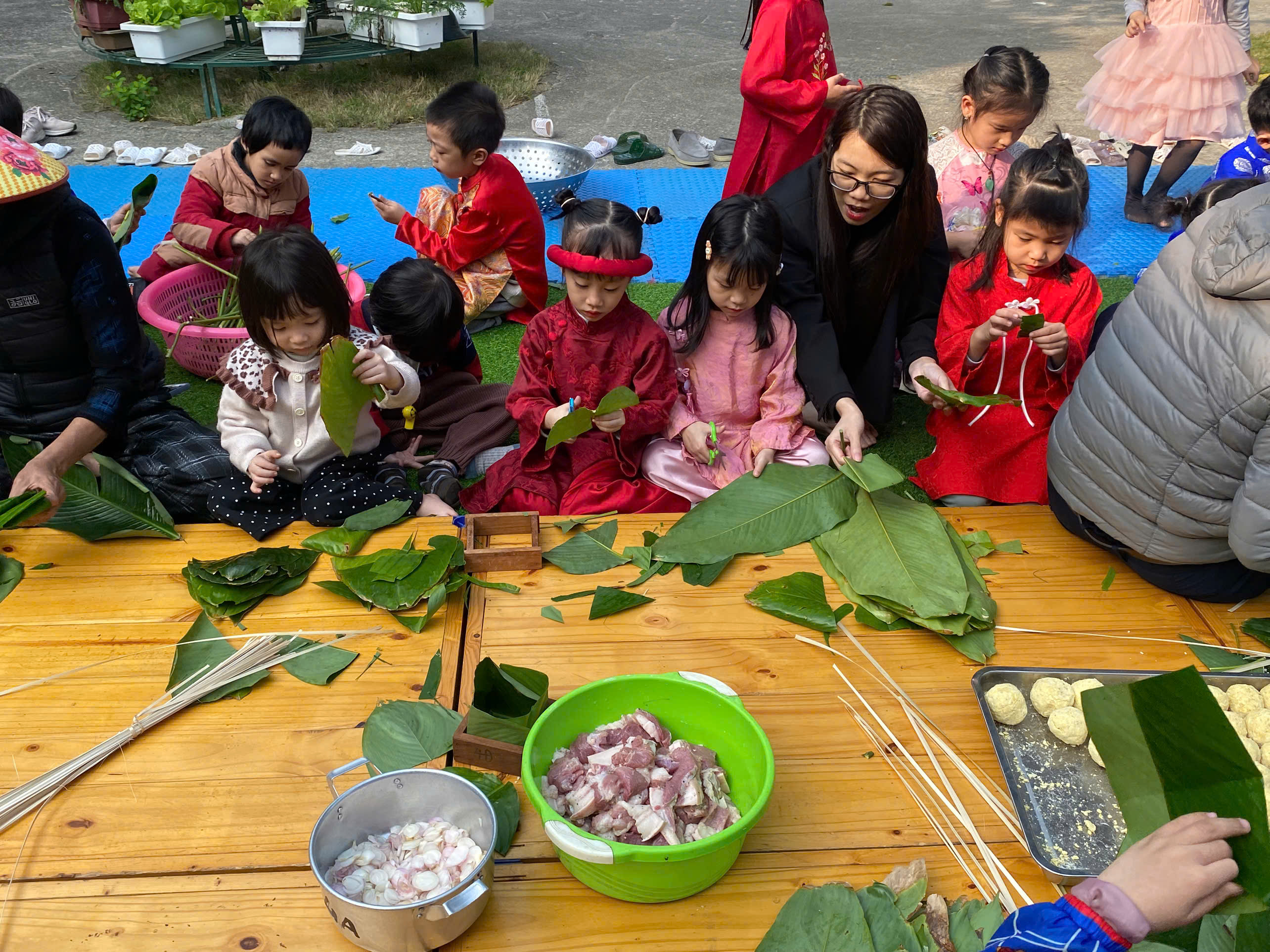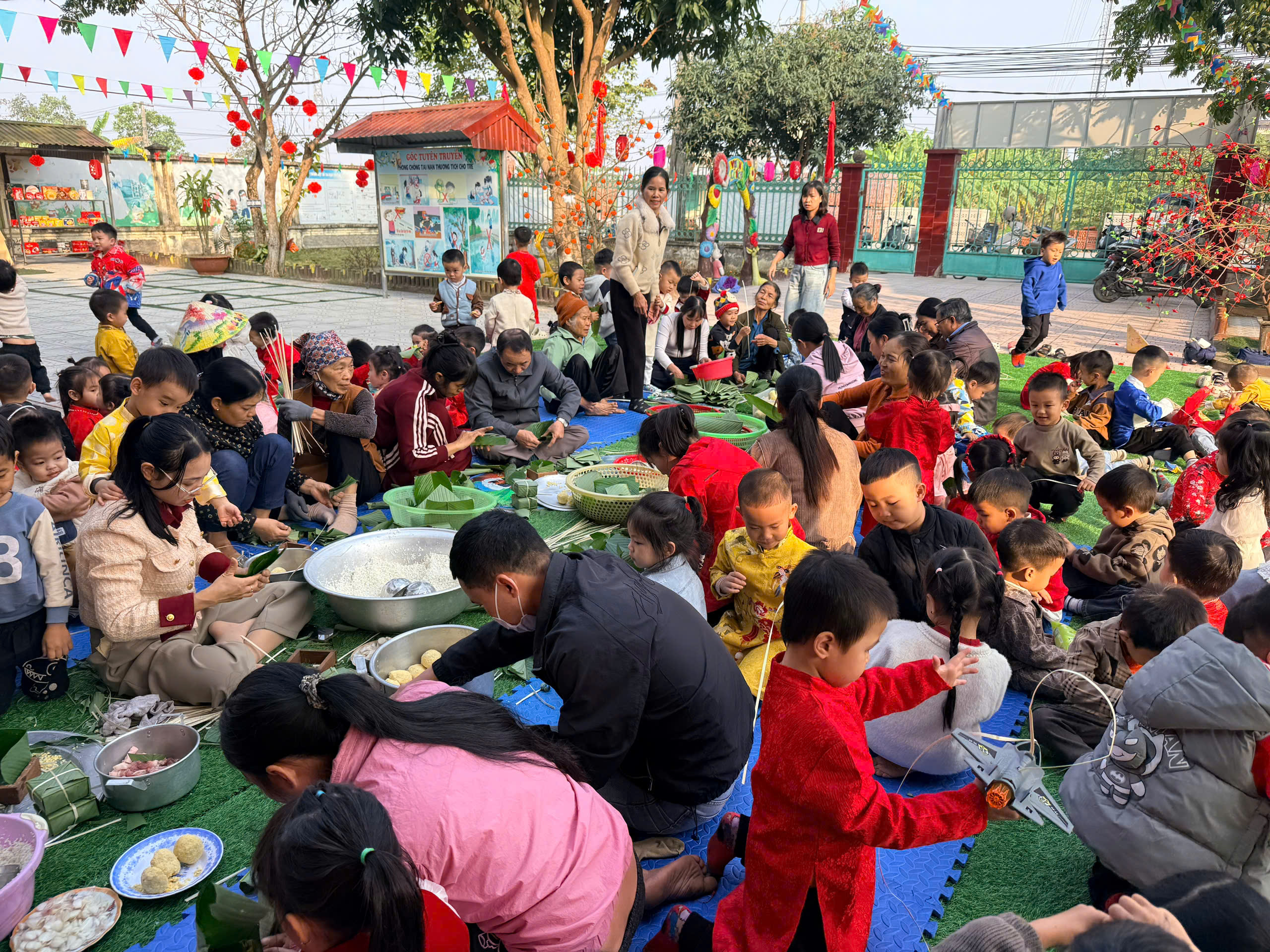 Ngày thứ hai, hoạt động trải nghiệm “Gói bánh chưng xanh” tiếp tục mang đến nhiều cảm xúc ấm áp và đáng nhớ. Dưới sự hướng dẫn ân cần của các cô giáo, cùng sự đồng hành của phụ huynh, các bé được tìm hiểu về ý nghĩa của bánh chưng – biểu tượng không thể thiếu trong ngày Tết cổ truyền của dân tộc Việt Nam. Từ việc làm quen với lá dong, gạo nếp, đỗ xanh, đến những thao tác gói bánh đầu đời, dù còn vụng về nhưng các bé đều vô cùng hào hứng, tự hào khi được trực tiếp tham gia. Những chiếc bánh chưng xanh được gói không chỉ chứa đựng nguyên liệu của Tết mà còn gói trọn yêu thương, sự sẻ chia và những bài học đầu đời về truyền thống quê hương.