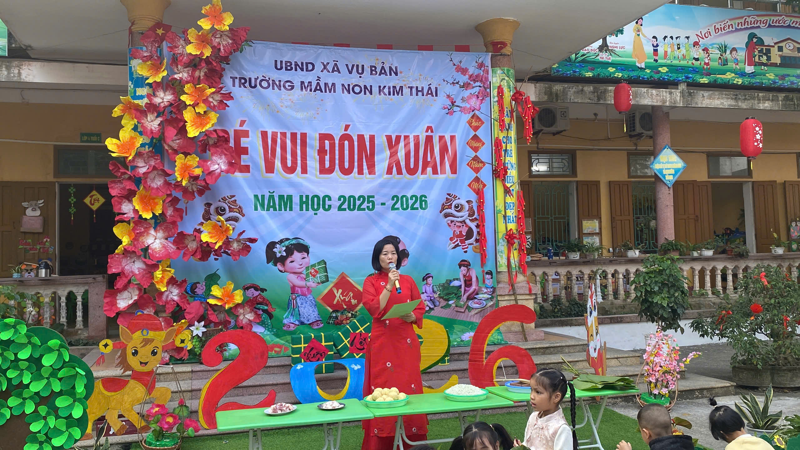 Những ngày cận kề Tết Nguyên đán, Trường Mầm non Kim Thái như khoác lên mình chiếc áo mới rực rỡ sắc xuân. Từ cổng trường đến từng góc sân, hành lang lớp học đều được trang trí ngập tràn hoa đào, hoa mai, câu đối đỏ, đèn lồng… tạo nên không gian ấm áp, tươi vui, mang đậm hương vị Tết cổ truyền. Tiếng cười nói rộn ràng, ánh mắt háo hức của trẻ thơ khiến sân trường những ngày này trở nên nhộn nhịp và tràn đầy sức sống hơn bao giờ hết.
