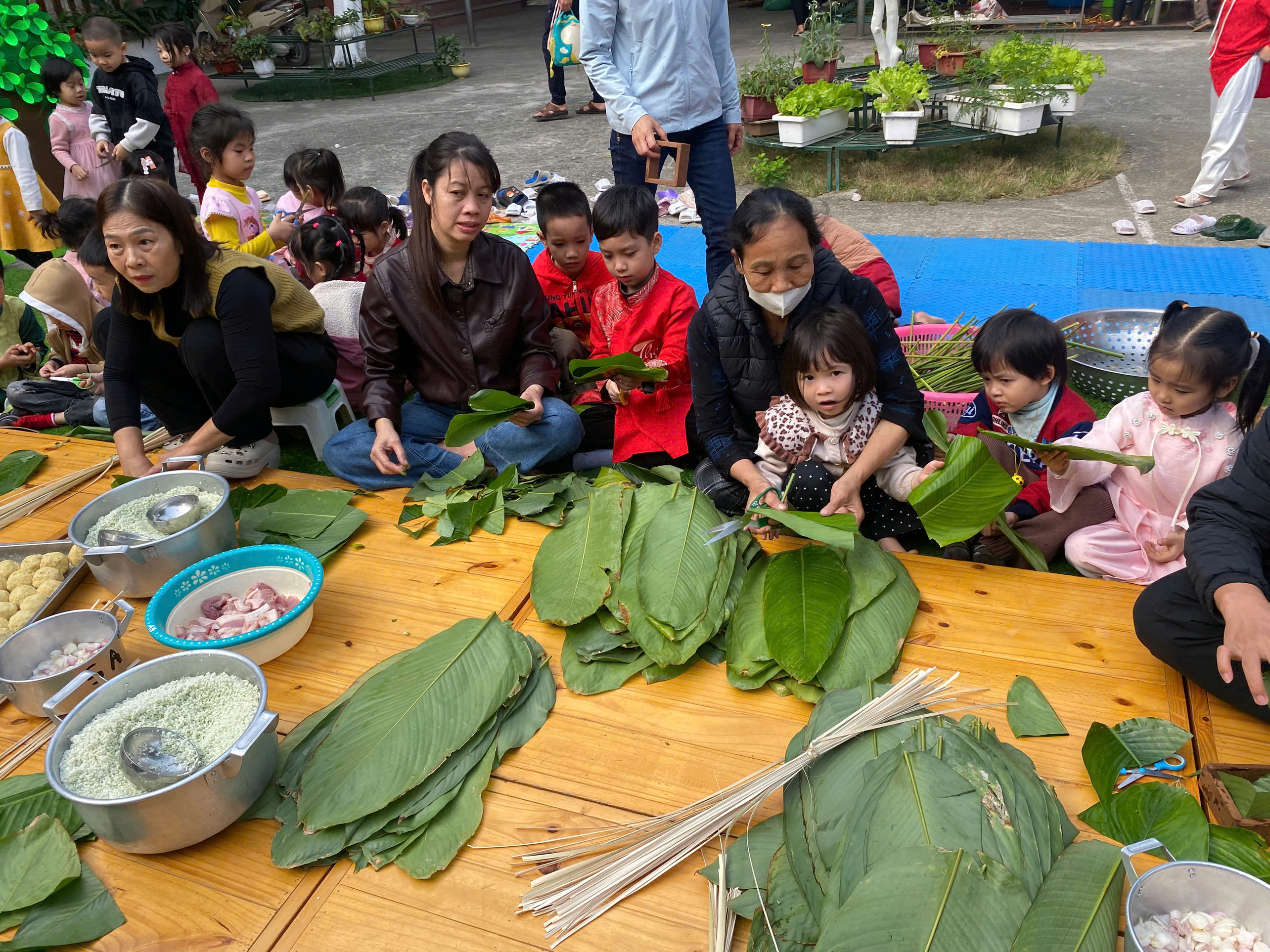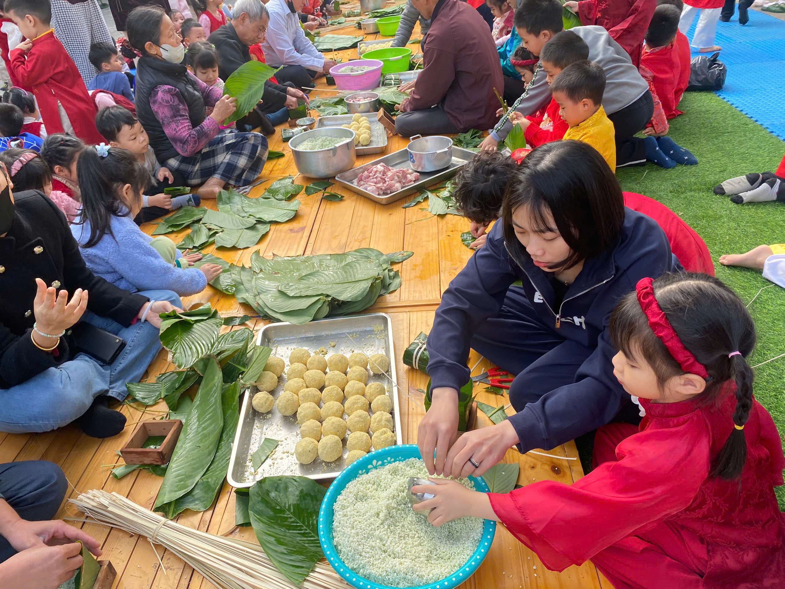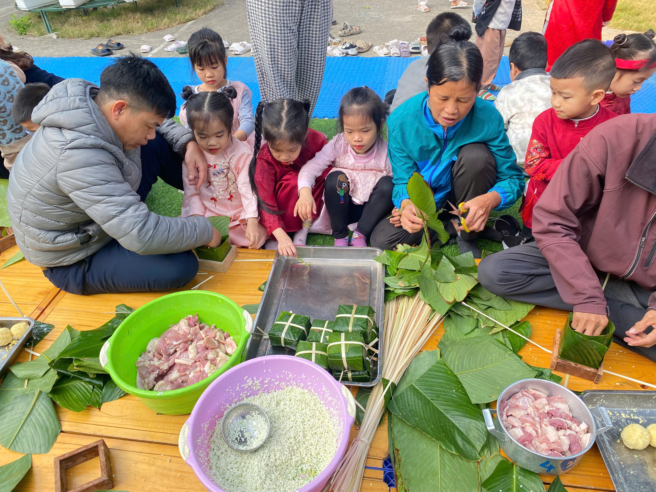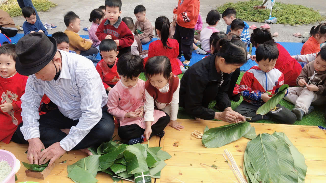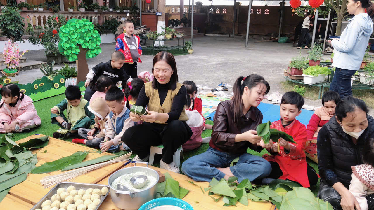 Ngày thứ hai, hoạt động trải nghiệm “Gói bánh chưng xanh” tiếp tục mang đến nhiều cảm xúc ấm áp và đáng nhớ. Dưới sự hướng dẫn ân cần của các cô giáo, cùng sự đồng hành của phụ huynh, các bé được tìm hiểu về ý nghĩa của bánh chưng – biểu tượng không thể thiếu trong ngày Tết cổ truyền của dân tộc Việt Nam. Từ việc làm quen với lá dong, gạo nếp, đỗ xanh, đến những thao tác gói bánh đầu đời, dù còn vụng về nhưng các bé đều vô cùng hào hứng, tự hào khi được trực tiếp tham gia. Những chiếc bánh chưng xanh được gói không chỉ chứa đựng nguyên liệu của Tết mà còn gói trọn yêu thương, sự sẻ chia và những bài học đầu đời về truyền thống quê hương.