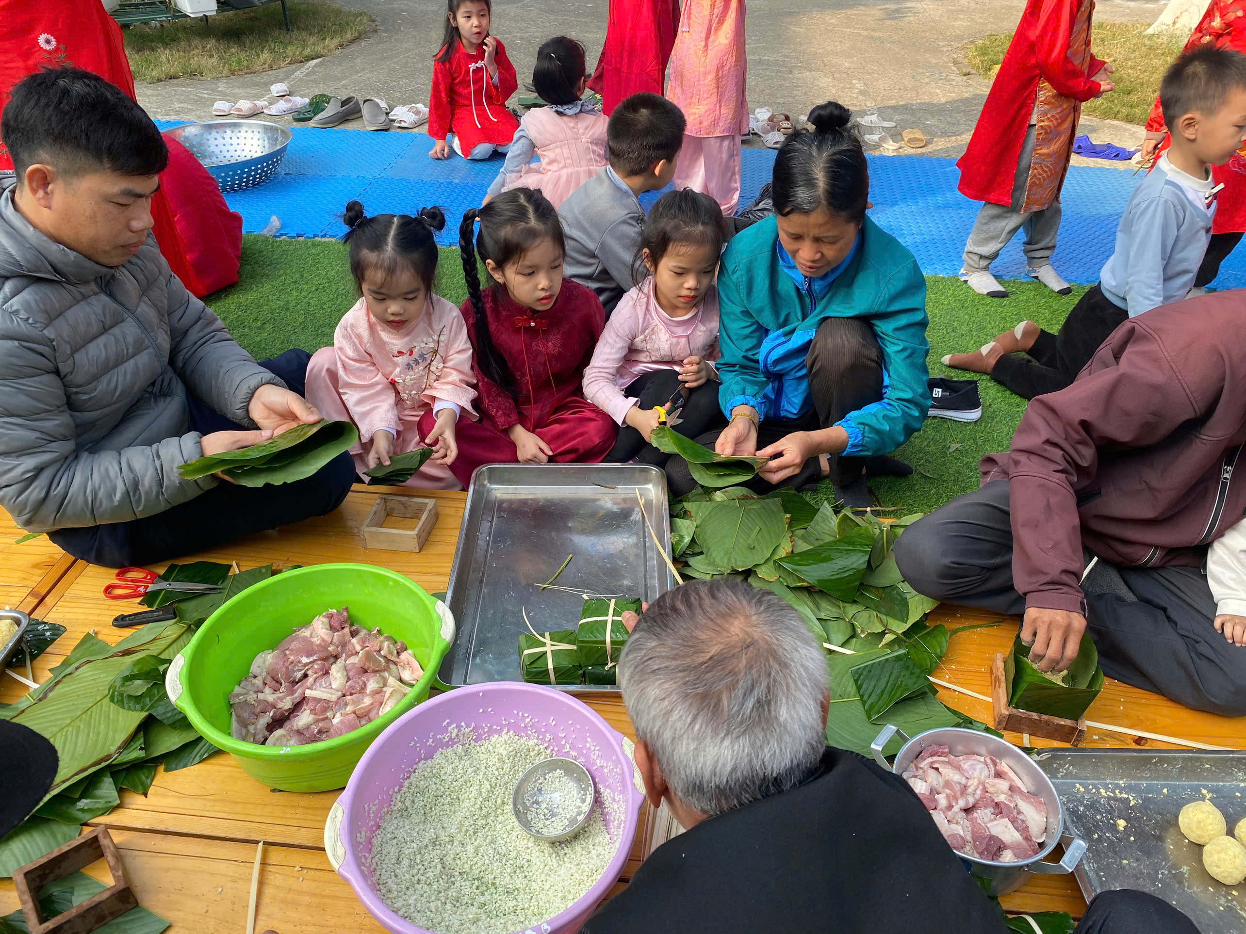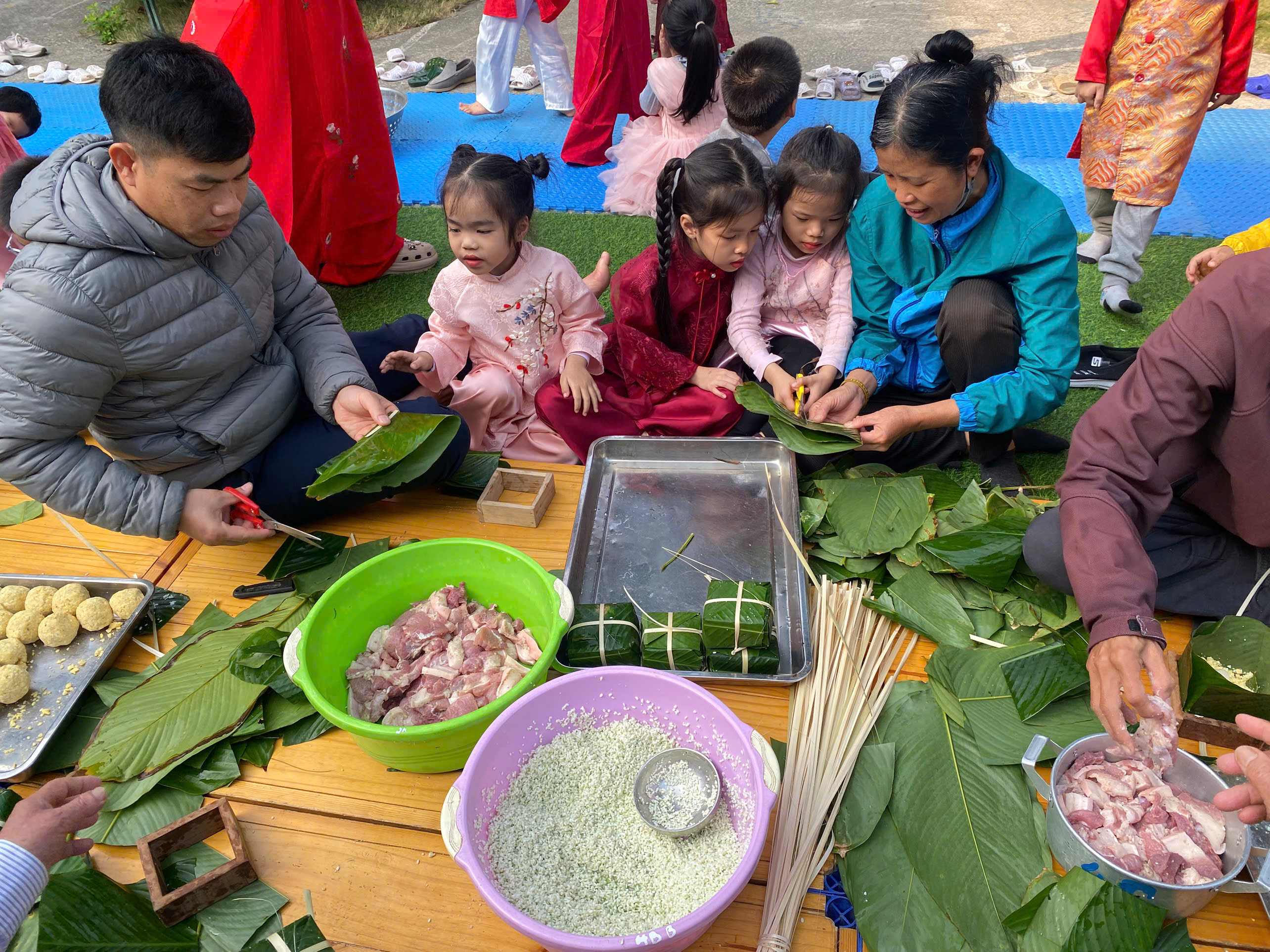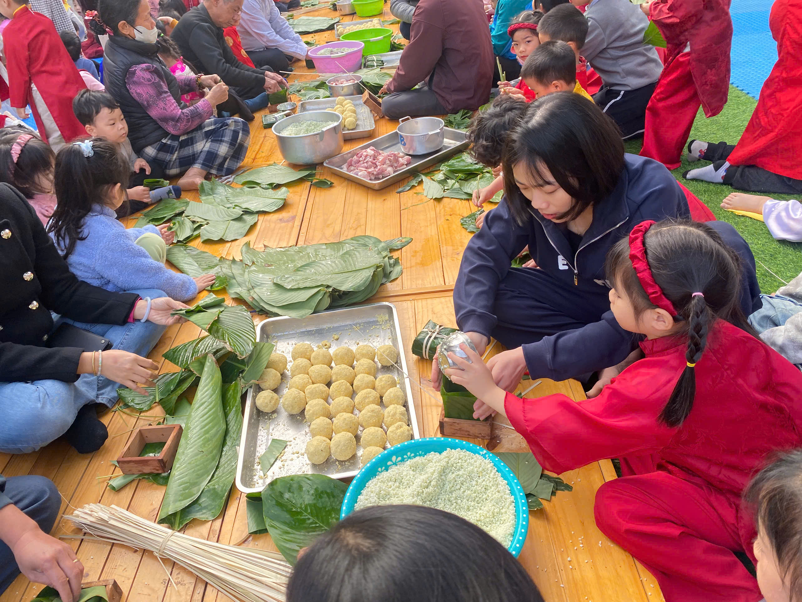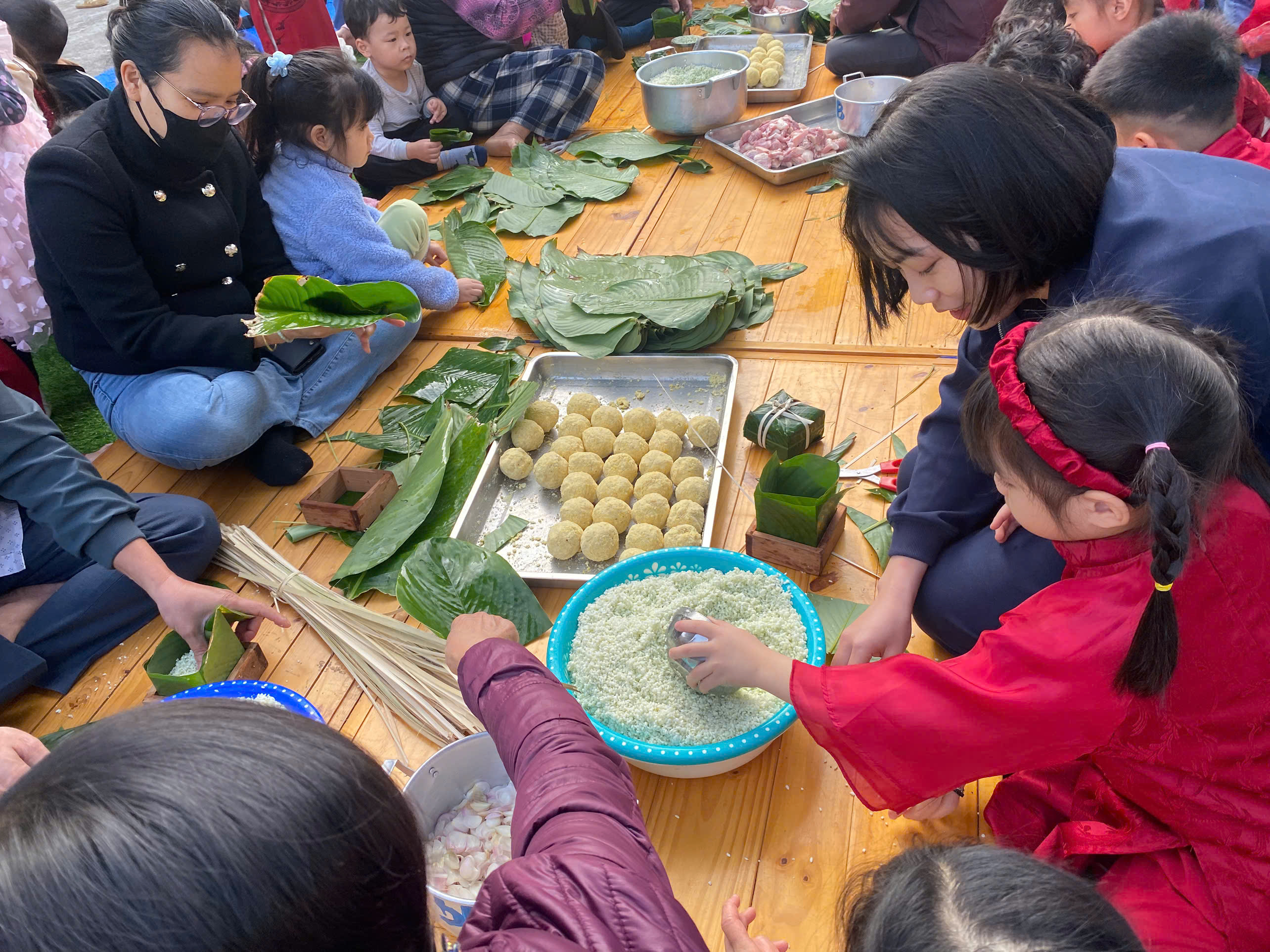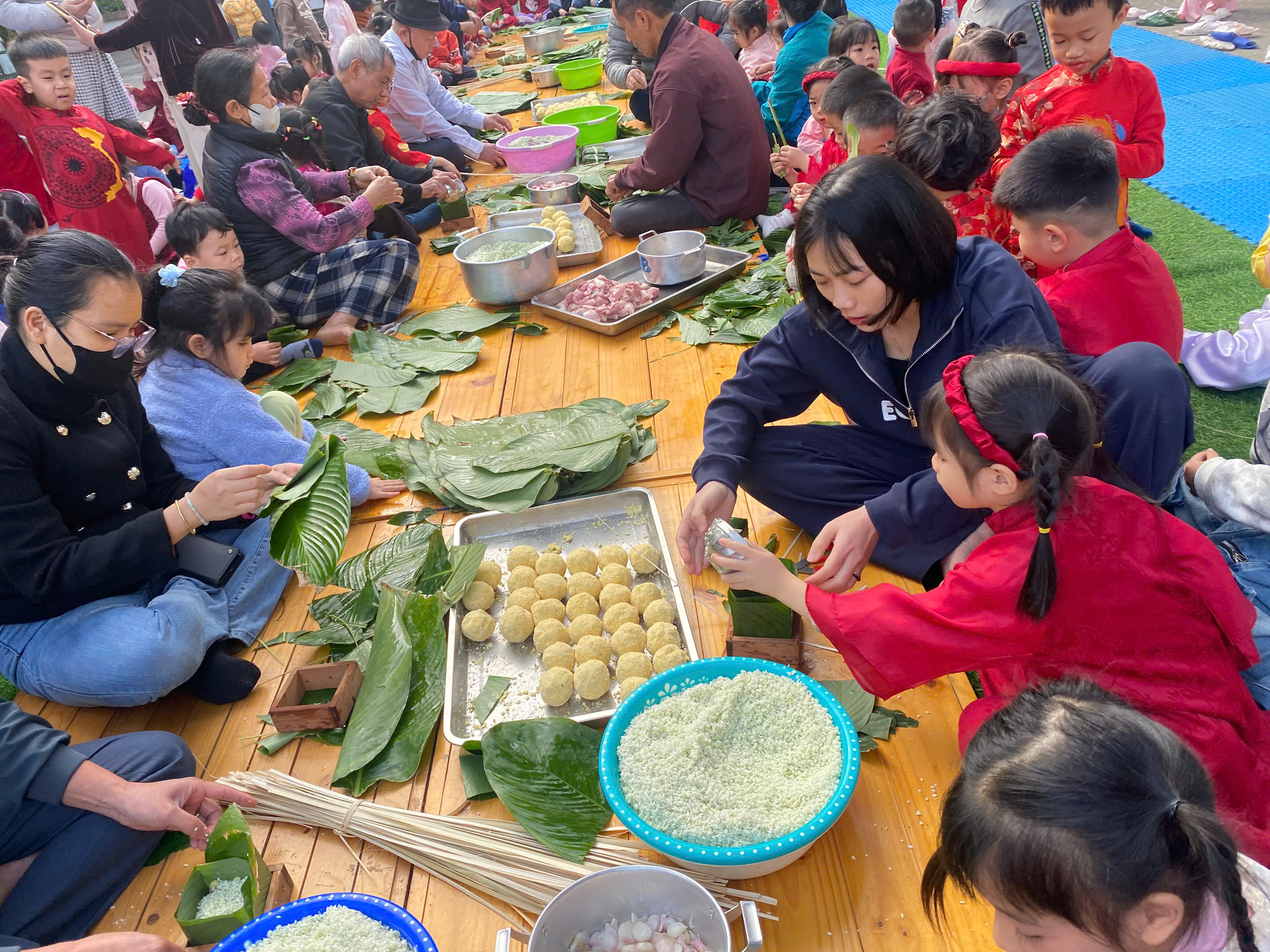 Ngày thứ hai, hoạt động trải nghiệm “Gói bánh chưng xanh” tiếp tục mang đến nhiều cảm xúc ấm áp và đáng nhớ. Dưới sự hướng dẫn ân cần của các cô giáo, cùng sự đồng hành của phụ huynh, các bé được tìm hiểu về ý nghĩa của bánh chưng – biểu tượng không thể thiếu trong ngày Tết cổ truyền của dân tộc Việt Nam. Từ việc làm quen với lá dong, gạo nếp, đỗ xanh, đến những thao tác gói bánh đầu đời, dù còn vụng về nhưng các bé đều vô cùng hào hứng, tự hào khi được trực tiếp tham gia. Những chiếc bánh chưng xanh được gói không chỉ chứa đựng nguyên liệu của Tết mà còn gói trọn yêu thương, sự sẻ chia và những bài học đầu đời về truyền thống quê hương.