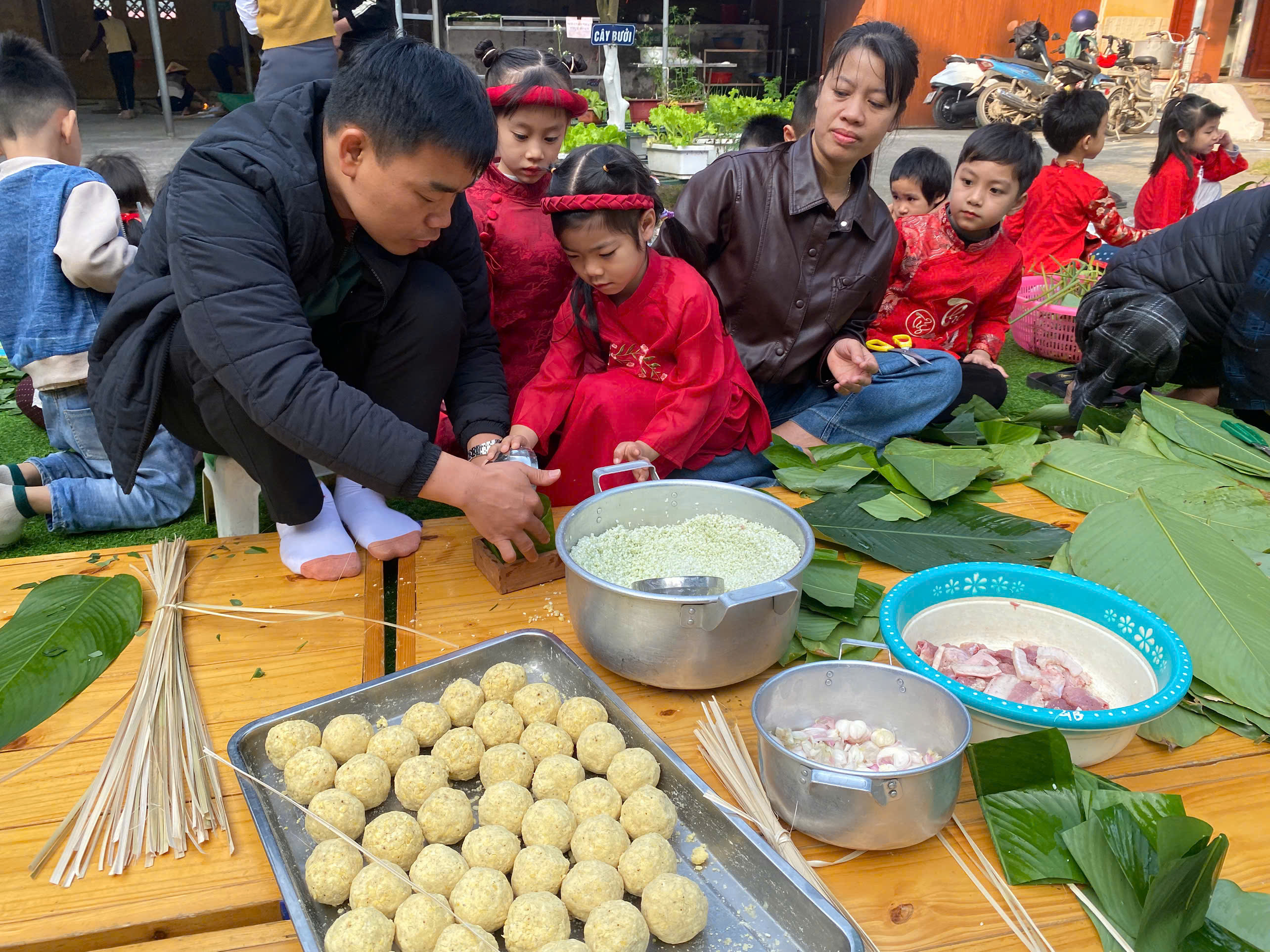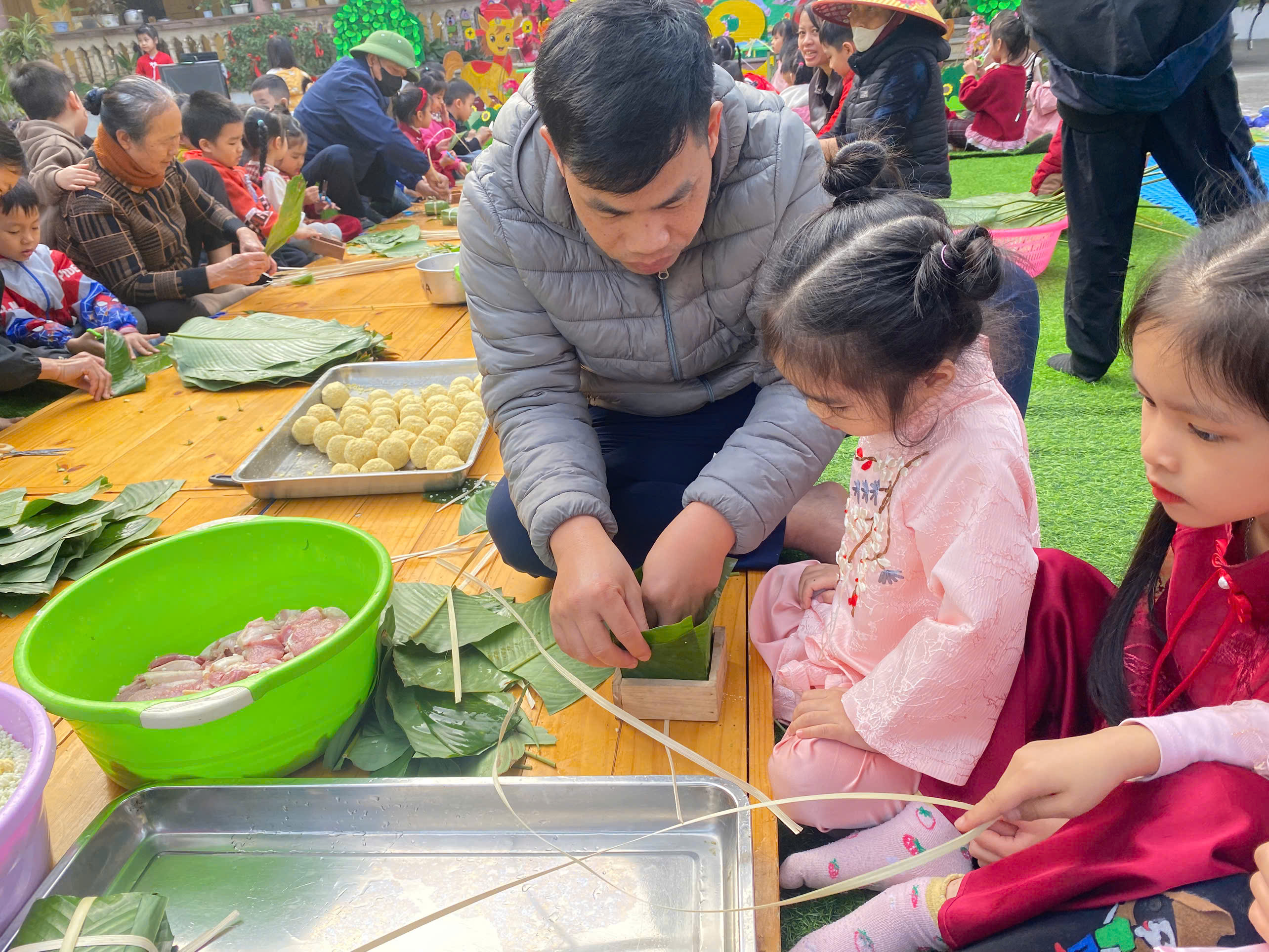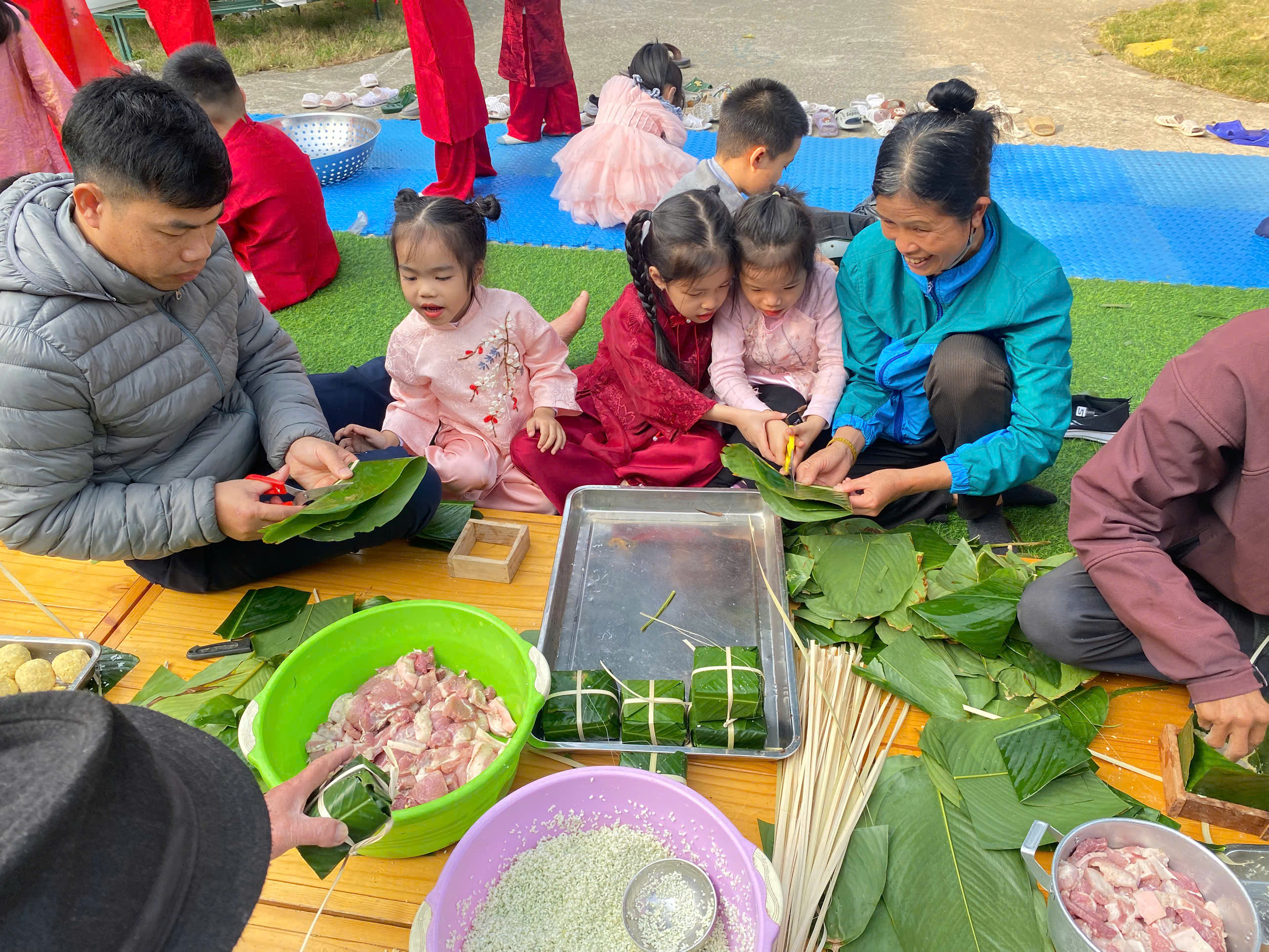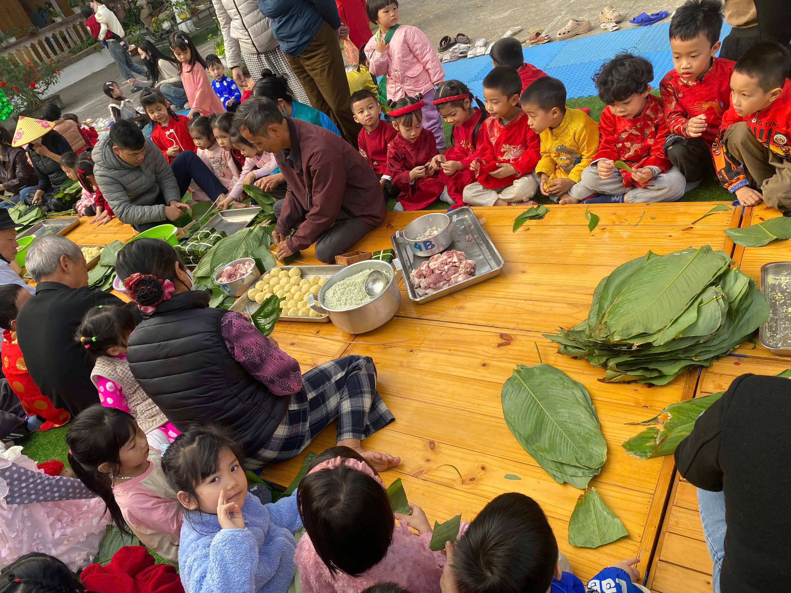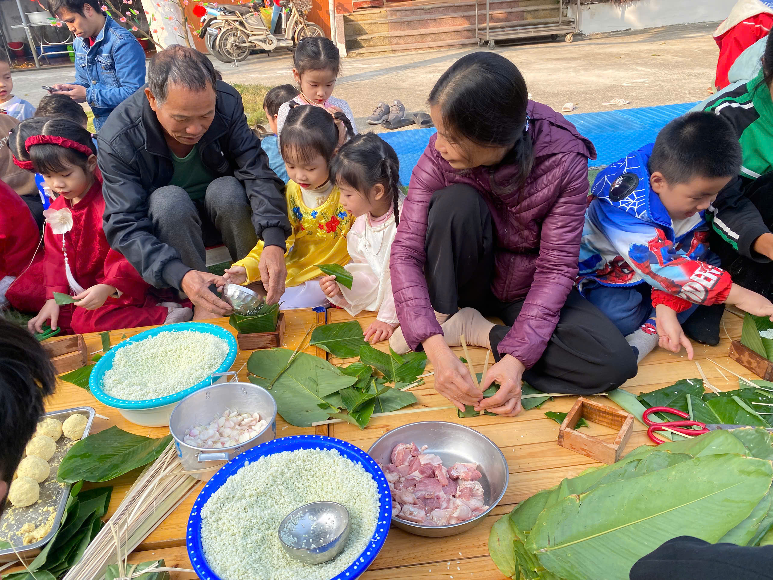 Ngày thứ hai, hoạt động trải nghiệm “Gói bánh chưng xanh” tiếp tục mang đến nhiều cảm xúc ấm áp và đáng nhớ. Dưới sự hướng dẫn ân cần của các cô giáo, cùng sự đồng hành của phụ huynh, các bé được tìm hiểu về ý nghĩa của bánh chưng – biểu tượng không thể thiếu trong ngày Tết cổ truyền của dân tộc Việt Nam. Từ việc làm quen với lá dong, gạo nếp, đỗ xanh, đến những thao tác gói bánh đầu đời, dù còn vụng về nhưng các bé đều vô cùng hào hứng, tự hào khi được trực tiếp tham gia. Những chiếc bánh chưng xanh được gói không chỉ chứa đựng nguyên liệu của Tết mà còn gói trọn yêu thương, sự sẻ chia và những bài học đầu đời về truyền thống quê hương.