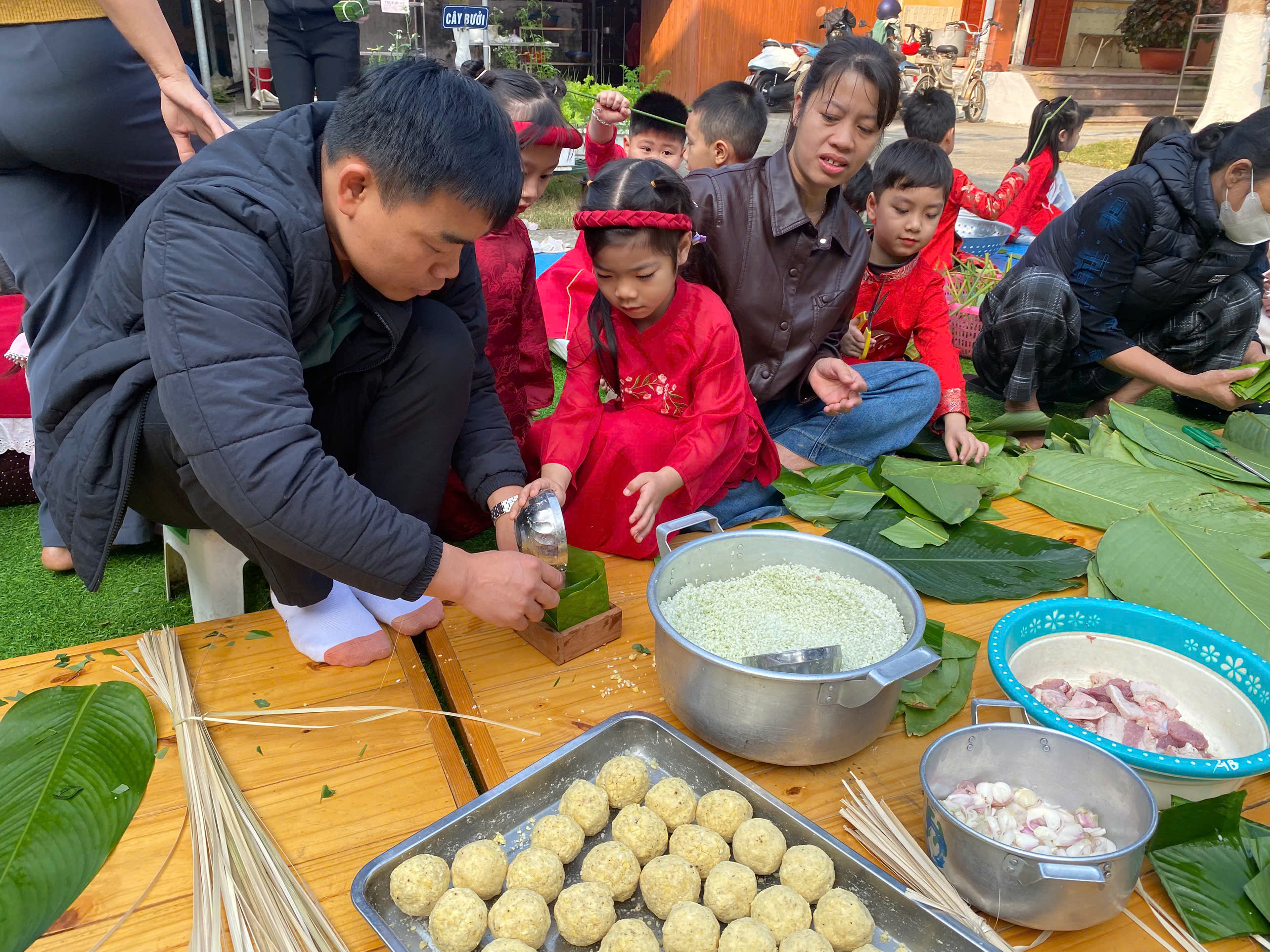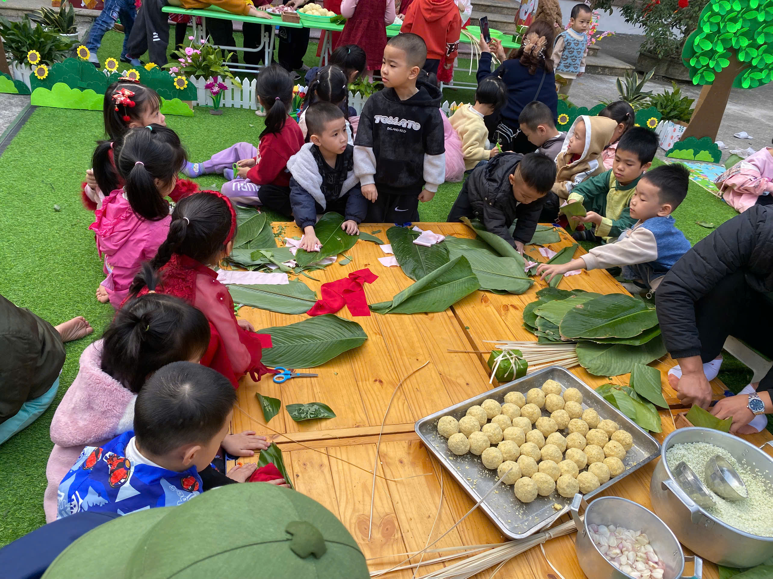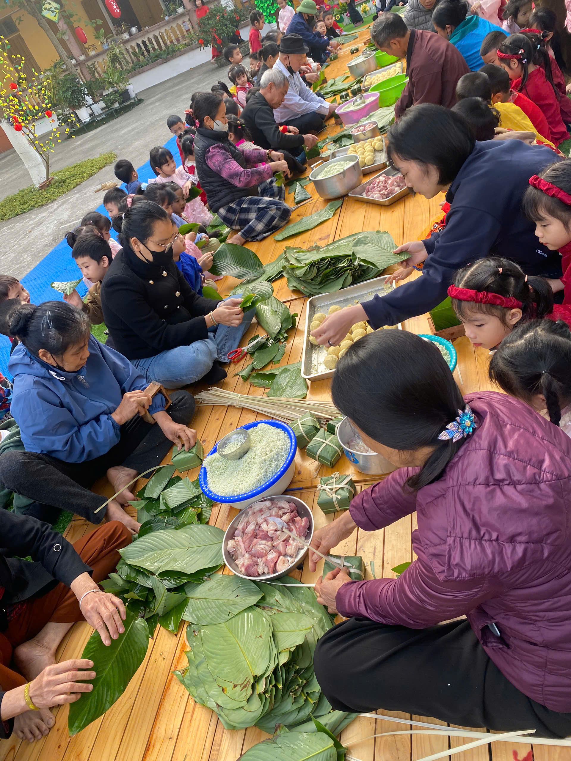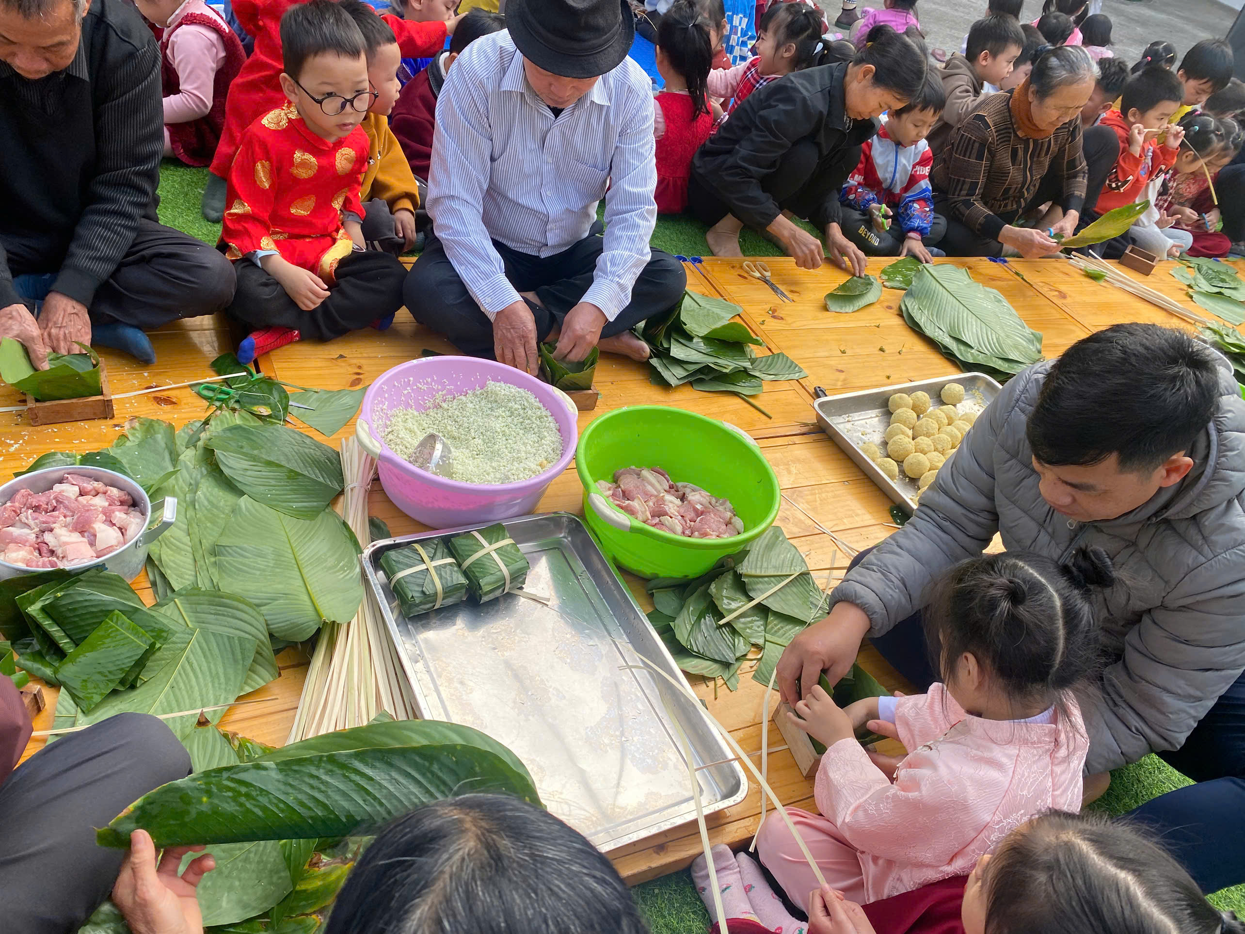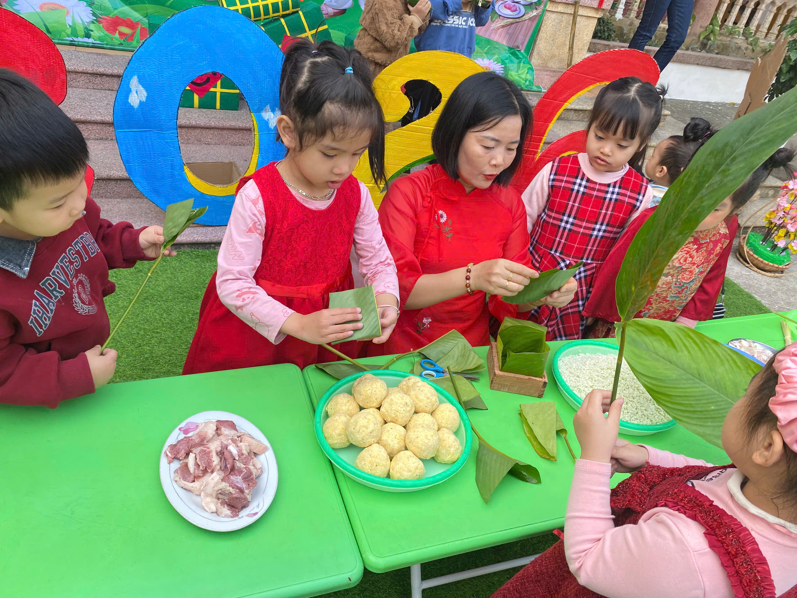 Ngày thứ hai, hoạt động trải nghiệm “Gói bánh chưng xanh” tiếp tục mang đến nhiều cảm xúc ấm áp và đáng nhớ. Dưới sự hướng dẫn ân cần của các cô giáo, cùng sự đồng hành của phụ huynh, các bé được tìm hiểu về ý nghĩa của bánh chưng – biểu tượng không thể thiếu trong ngày Tết cổ truyền của dân tộc Việt Nam. Từ việc làm quen với lá dong, gạo nếp, đỗ xanh, đến những thao tác gói bánh đầu đời, dù còn vụng về nhưng các bé đều vô cùng hào hứng, tự hào khi được trực tiếp tham gia. Những chiếc bánh chưng xanh được gói không chỉ chứa đựng nguyên liệu của Tết mà còn gói trọn yêu thương, sự sẻ chia và những bài học đầu đời về truyền thống quê hương.