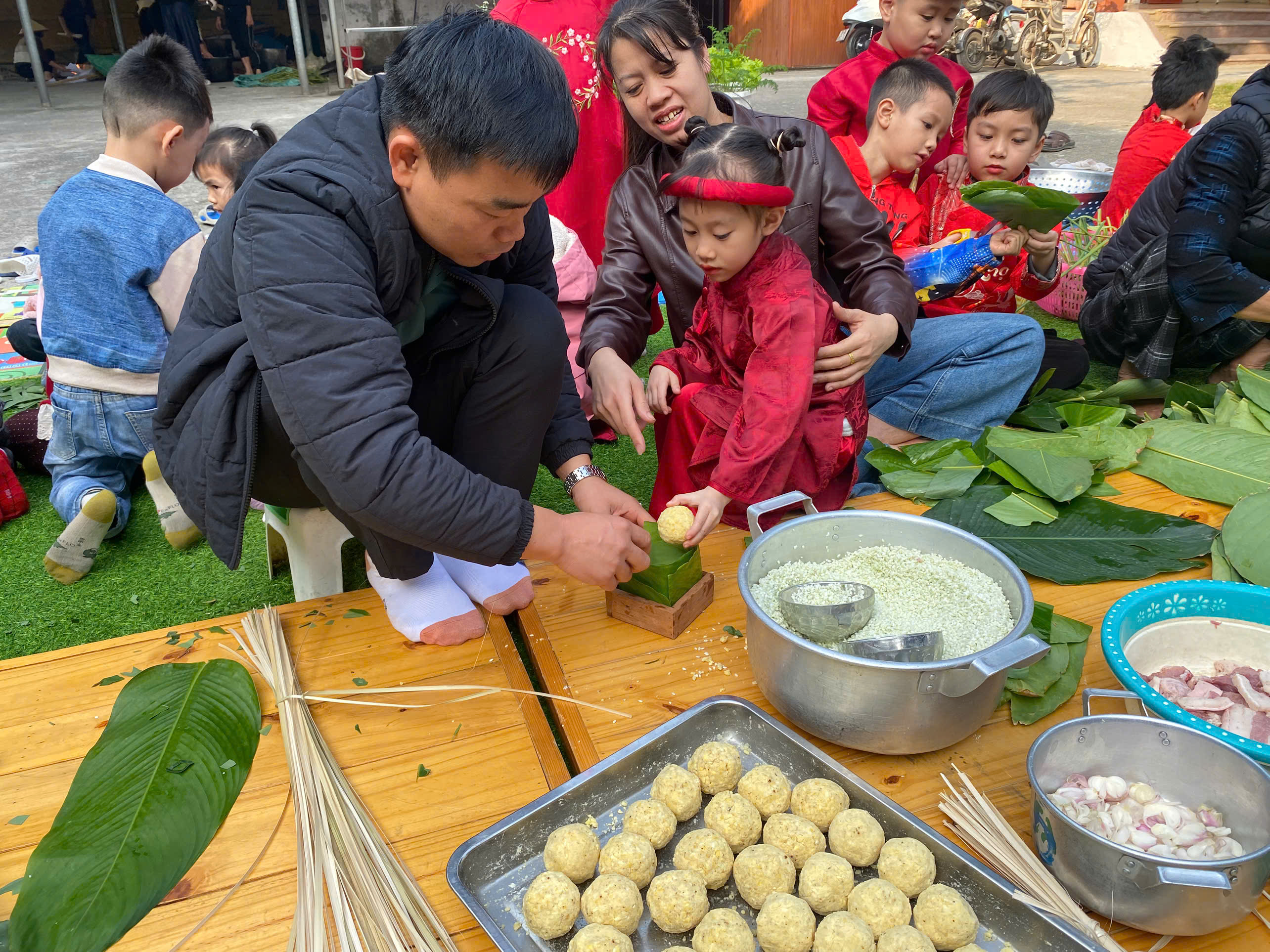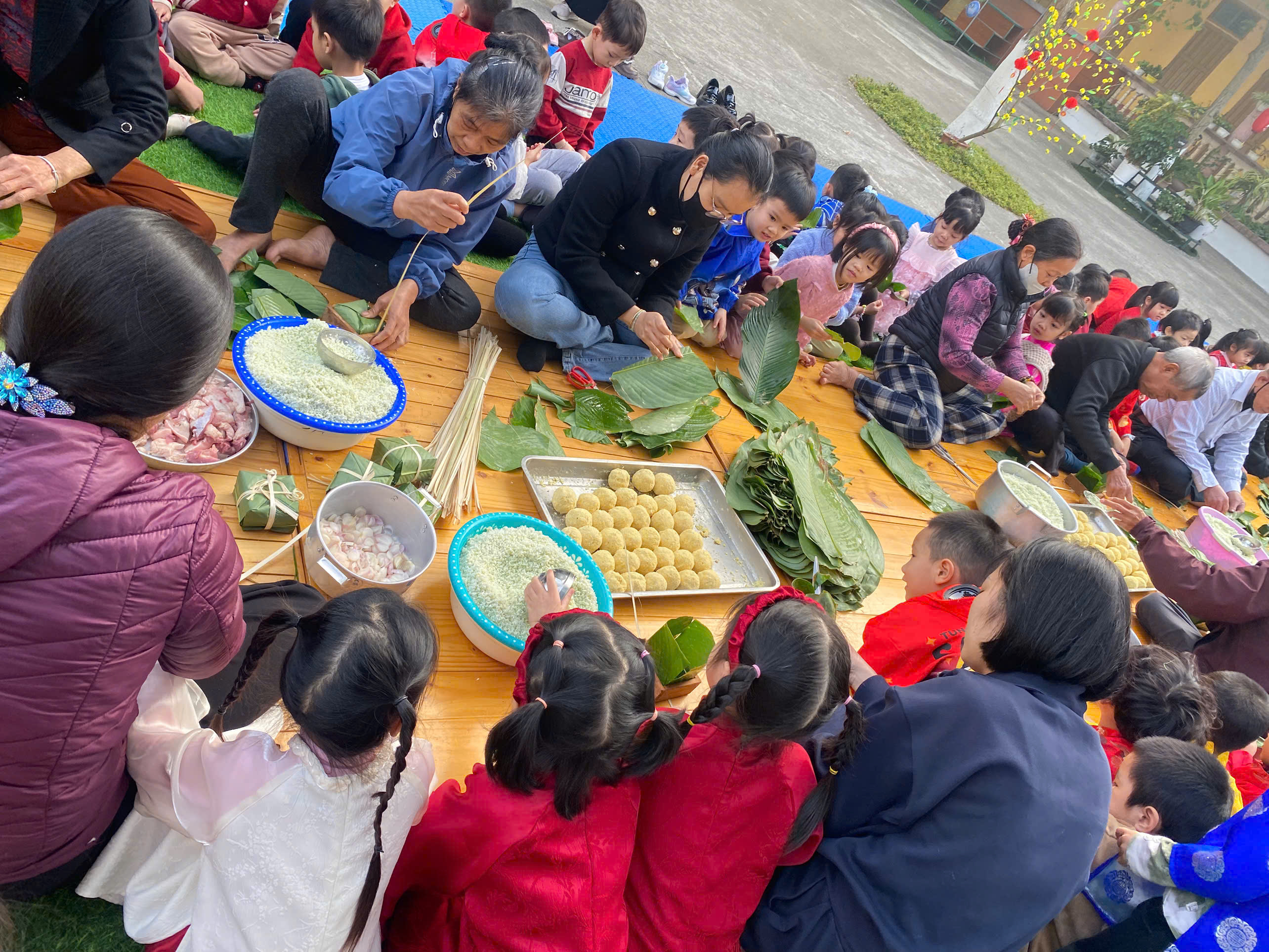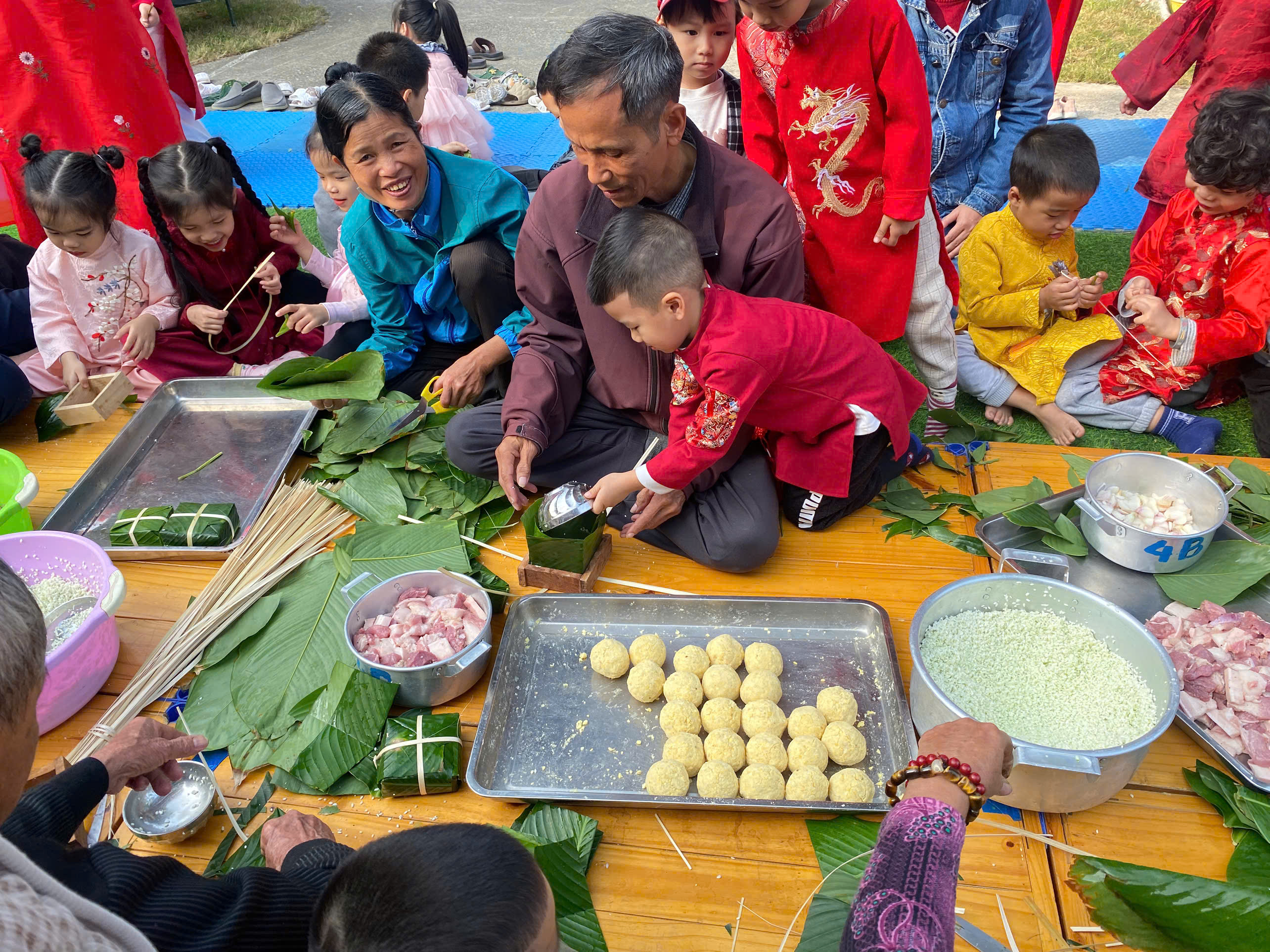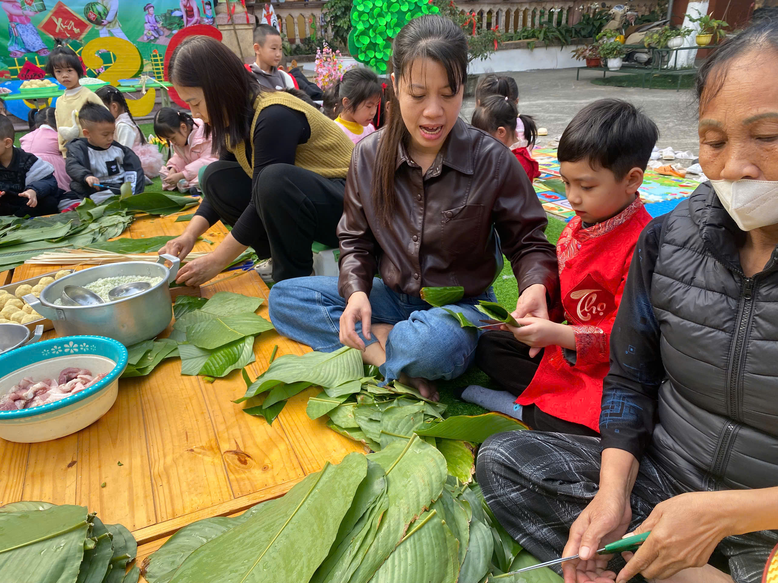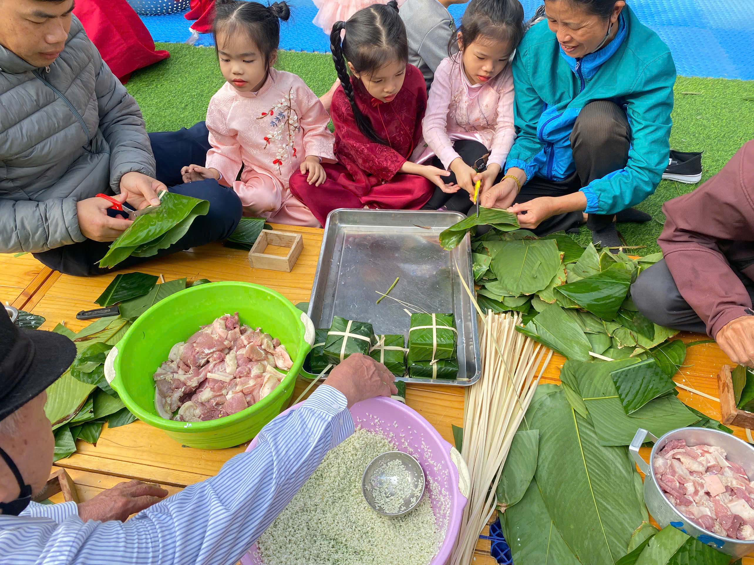 Ngày thứ hai, hoạt động trải nghiệm “Gói bánh chưng xanh” tiếp tục mang đến nhiều cảm xúc ấm áp và đáng nhớ. Dưới sự hướng dẫn ân cần của các cô giáo, cùng sự đồng hành của phụ huynh, các bé được tìm hiểu về ý nghĩa của bánh chưng – biểu tượng không thể thiếu trong ngày Tết cổ truyền của dân tộc Việt Nam. Từ việc làm quen với lá dong, gạo nếp, đỗ xanh, đến những thao tác gói bánh đầu đời, dù còn vụng về nhưng các bé đều vô cùng hào hứng, tự hào khi được trực tiếp tham gia. Những chiếc bánh chưng xanh được gói không chỉ chứa đựng nguyên liệu của Tết mà còn gói trọn yêu thương, sự sẻ chia và những bài học đầu đời về truyền thống quê hương.