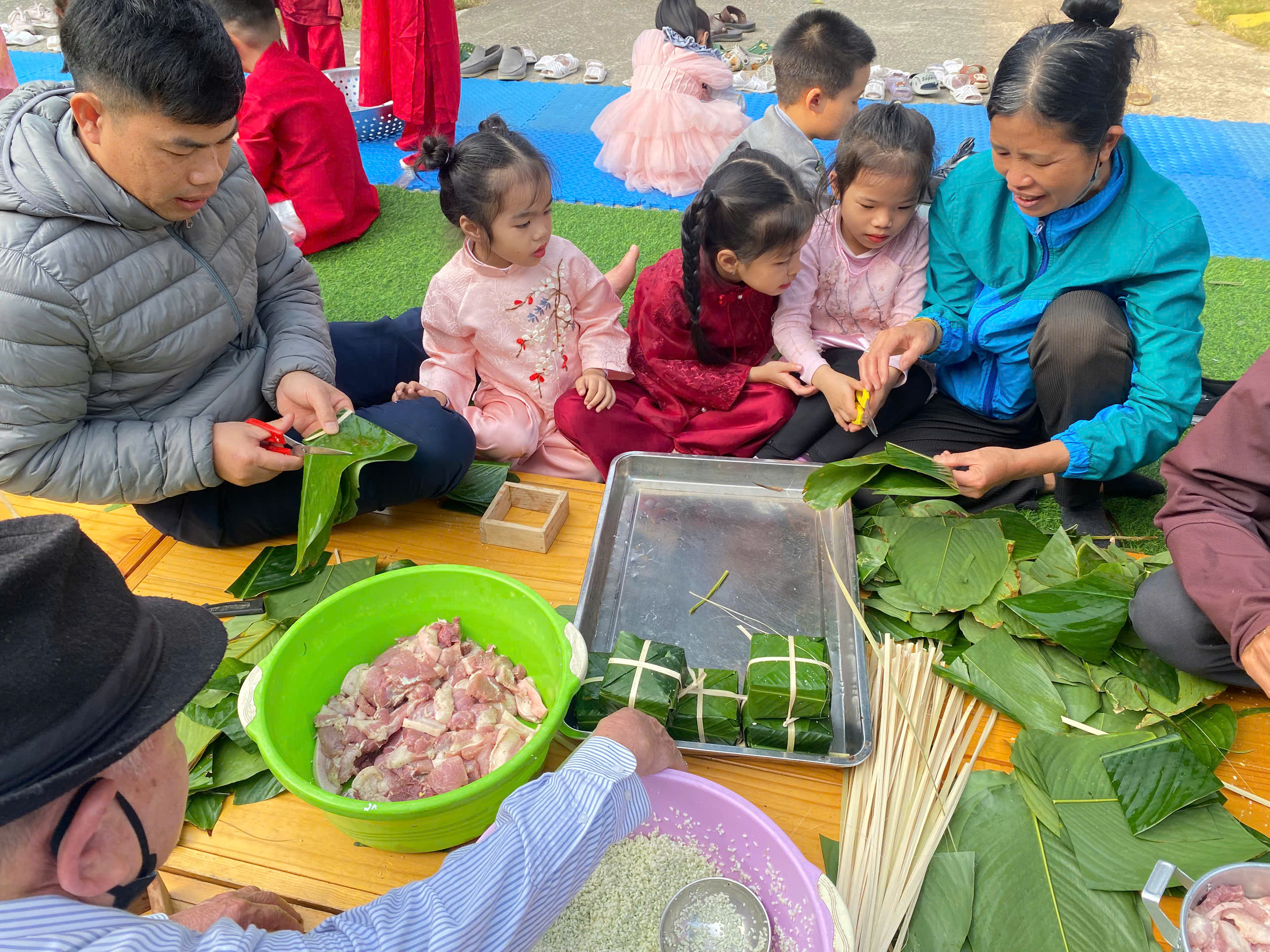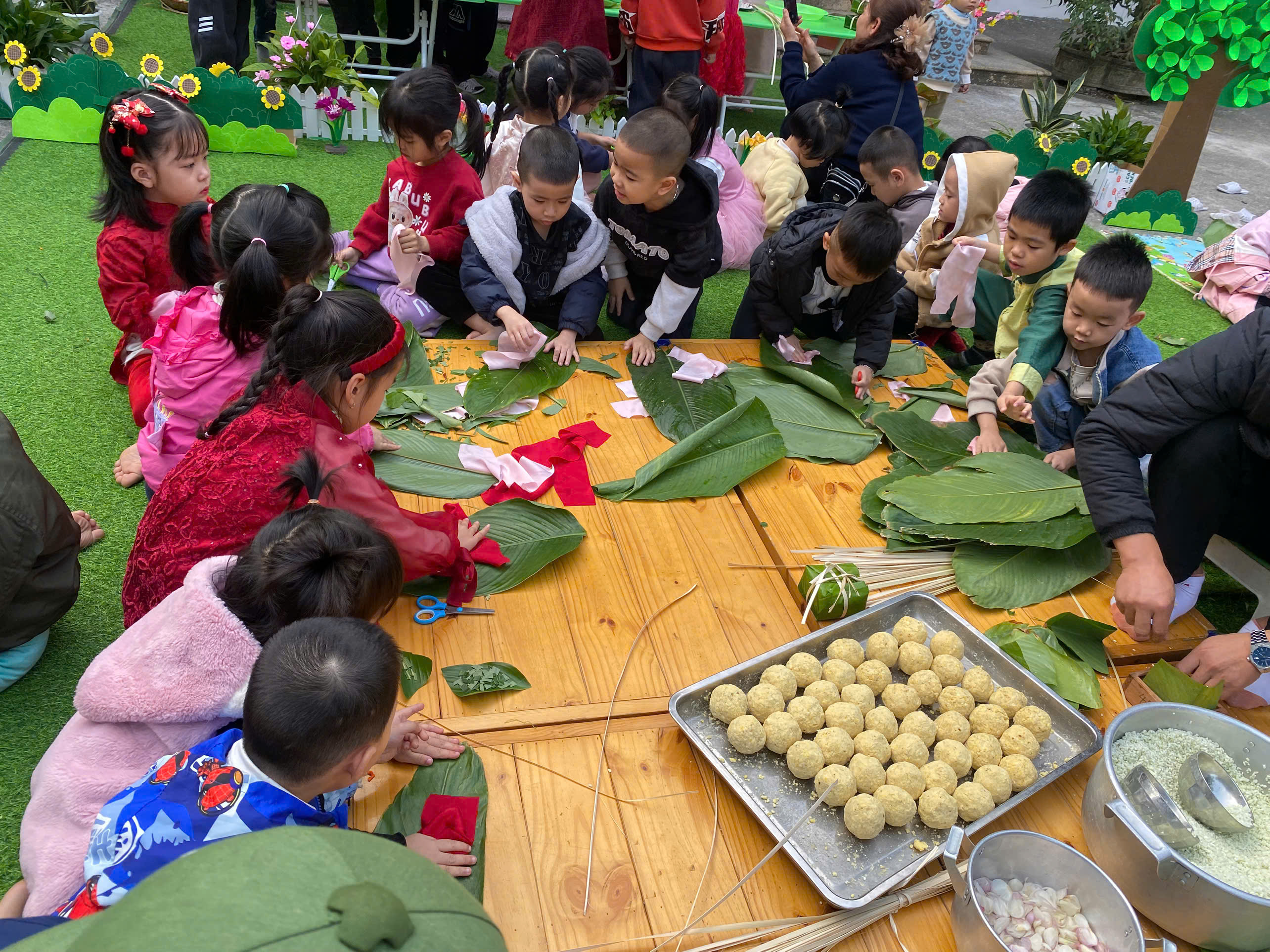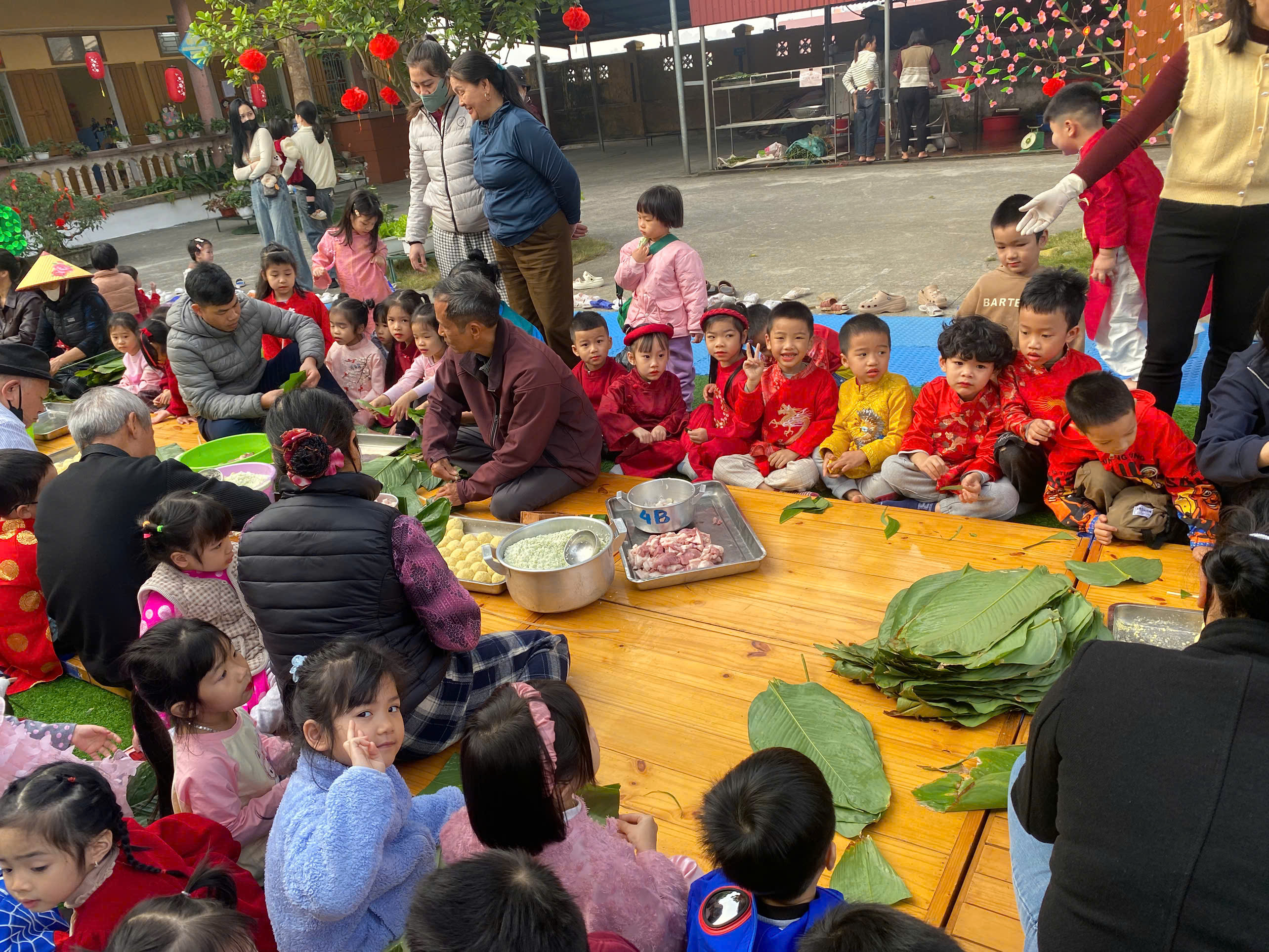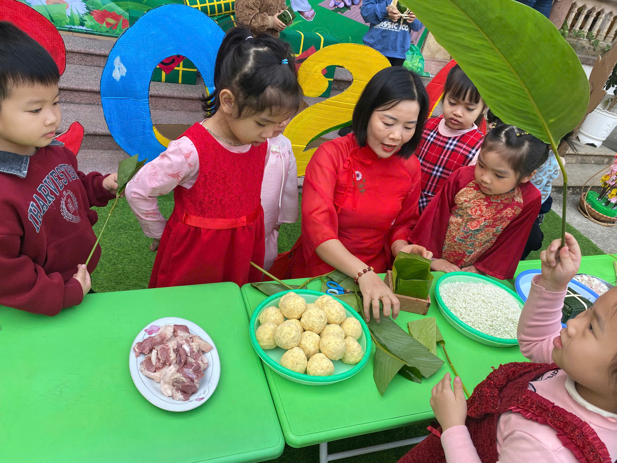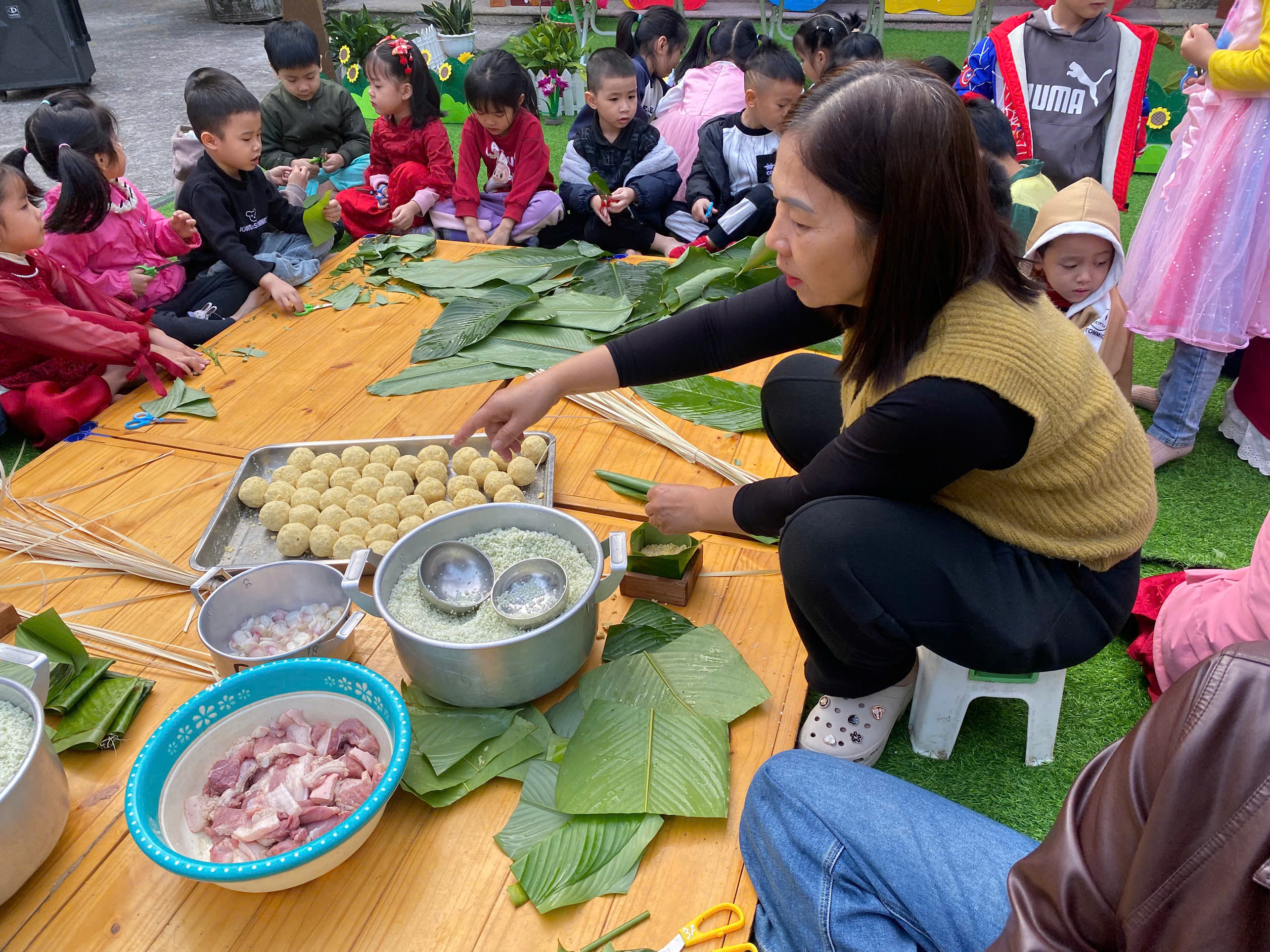 Ngày thứ hai, hoạt động trải nghiệm “Gói bánh chưng xanh” tiếp tục mang đến nhiều cảm xúc ấm áp và đáng nhớ. Dưới sự hướng dẫn ân cần của các cô giáo, cùng sự đồng hành của phụ huynh, các bé được tìm hiểu về ý nghĩa của bánh chưng – biểu tượng không thể thiếu trong ngày Tết cổ truyền của dân tộc Việt Nam. Từ việc làm quen với lá dong, gạo nếp, đỗ xanh, đến những thao tác gói bánh đầu đời, dù còn vụng về nhưng các bé đều vô cùng hào hứng, tự hào khi được trực tiếp tham gia. Những chiếc bánh chưng xanh được gói không chỉ chứa đựng nguyên liệu của Tết mà còn gói trọn yêu thương, sự sẻ chia và những bài học đầu đời về truyền thống quê hương.