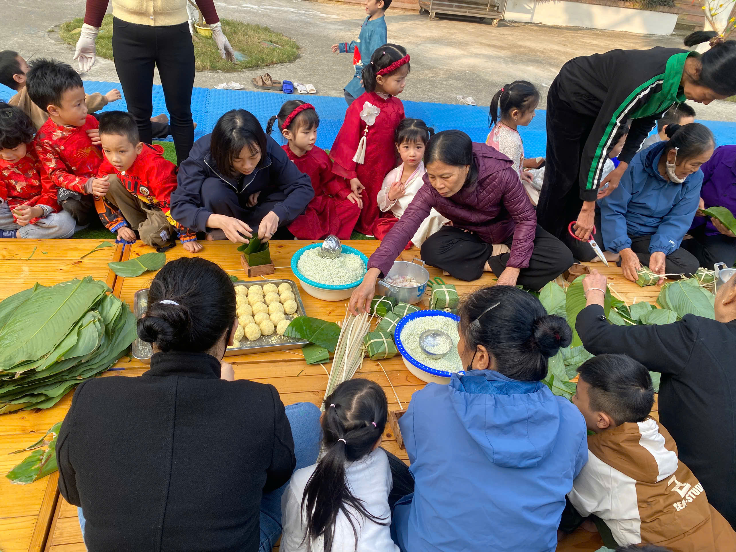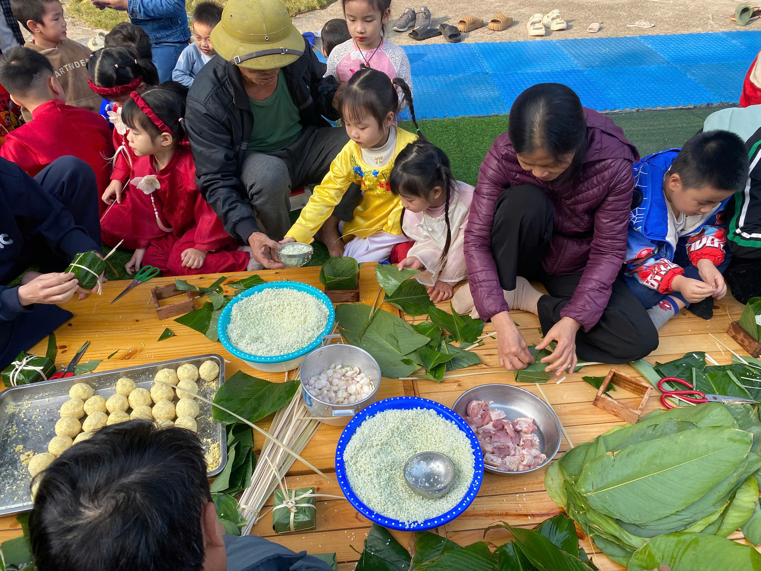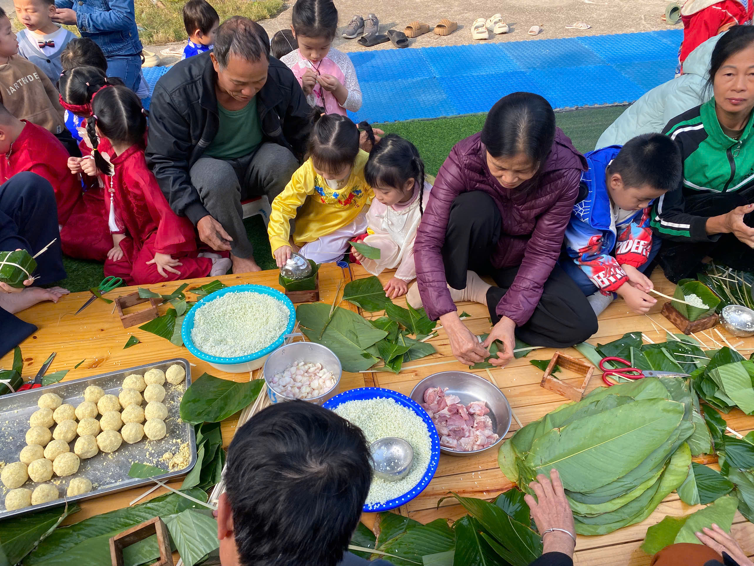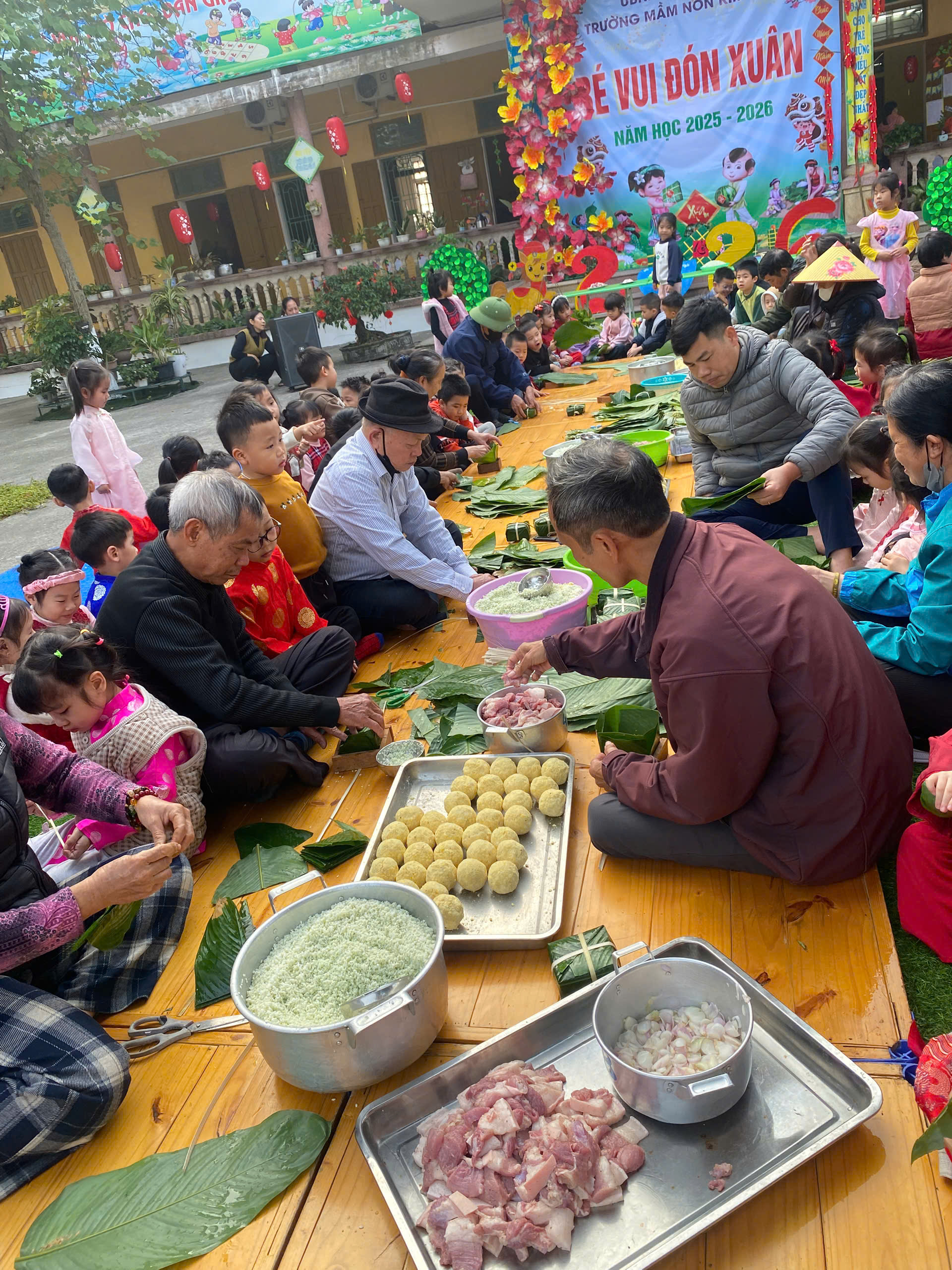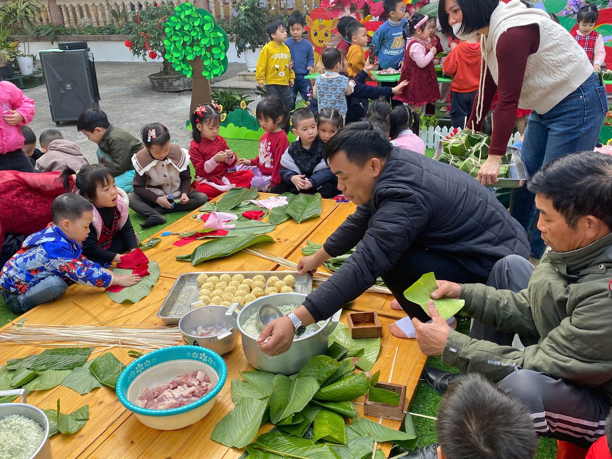 Ngày thứ hai, hoạt động trải nghiệm “Gói bánh chưng xanh” tiếp tục mang đến nhiều cảm xúc ấm áp và đáng nhớ. Dưới sự hướng dẫn ân cần của các cô giáo, cùng sự đồng hành của phụ huynh, các bé được tìm hiểu về ý nghĩa của bánh chưng – biểu tượng không thể thiếu trong ngày Tết cổ truyền của dân tộc Việt Nam. Từ việc làm quen với lá dong, gạo nếp, đỗ xanh, đến những thao tác gói bánh đầu đời, dù còn vụng về nhưng các bé đều vô cùng hào hứng, tự hào khi được trực tiếp tham gia. Những chiếc bánh chưng xanh được gói không chỉ chứa đựng nguyên liệu của Tết mà còn gói trọn yêu thương, sự sẻ chia và những bài học đầu đời về truyền thống quê hương.