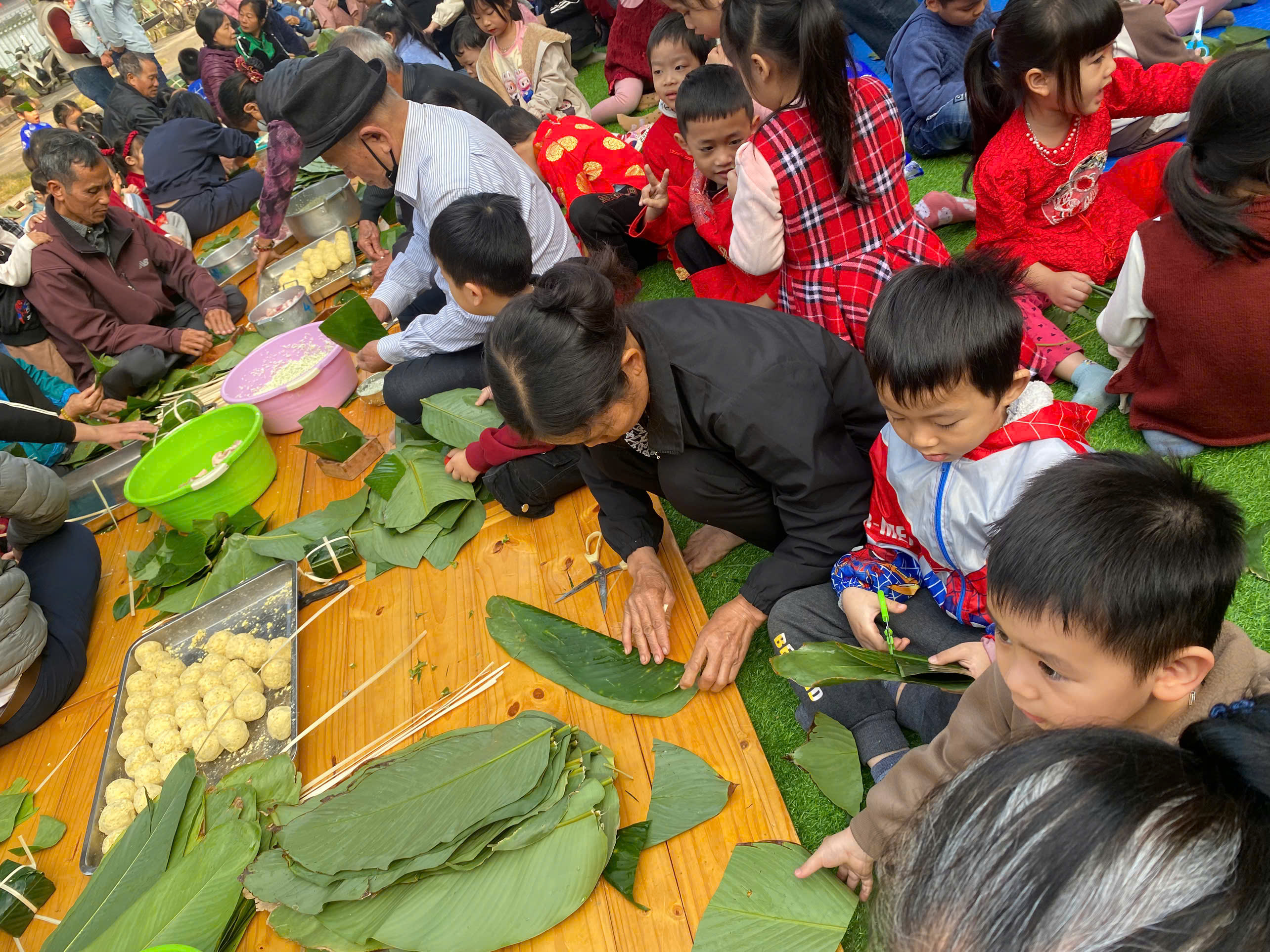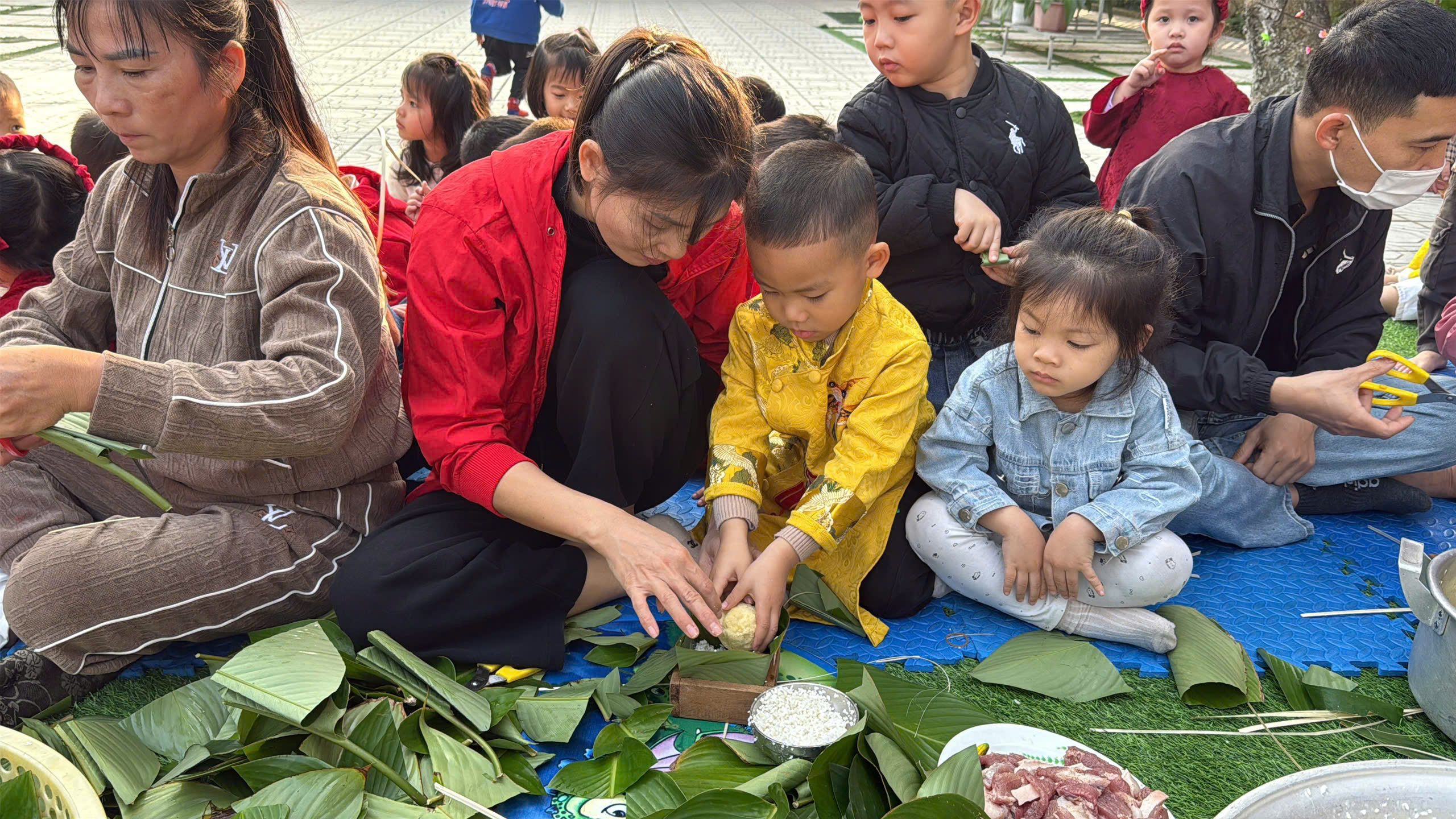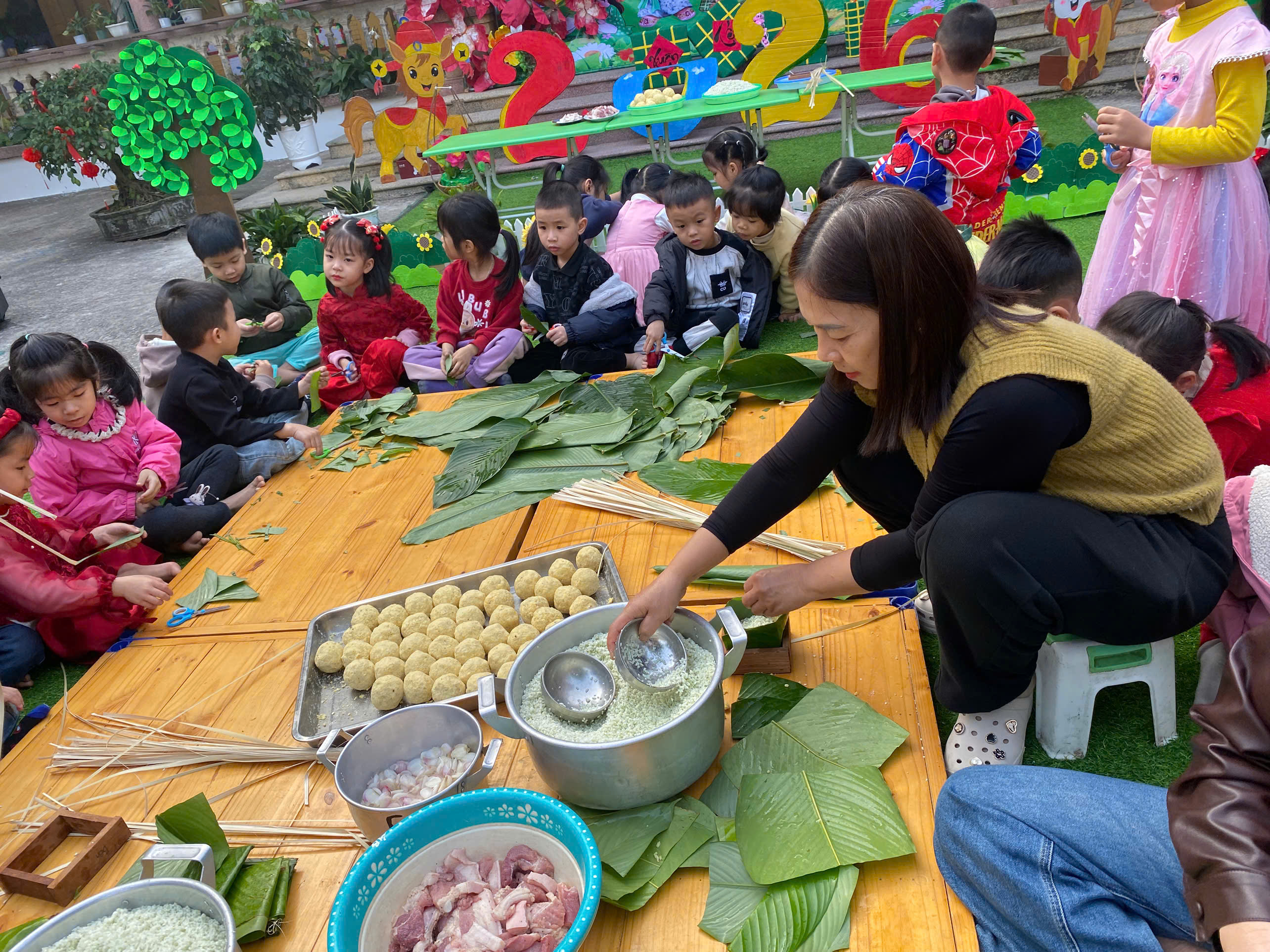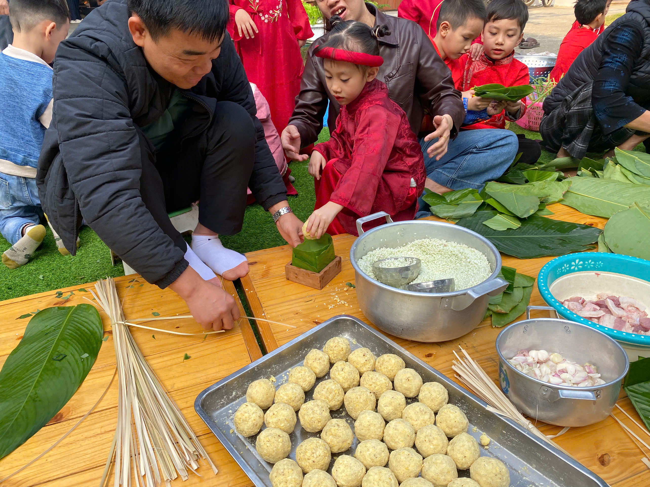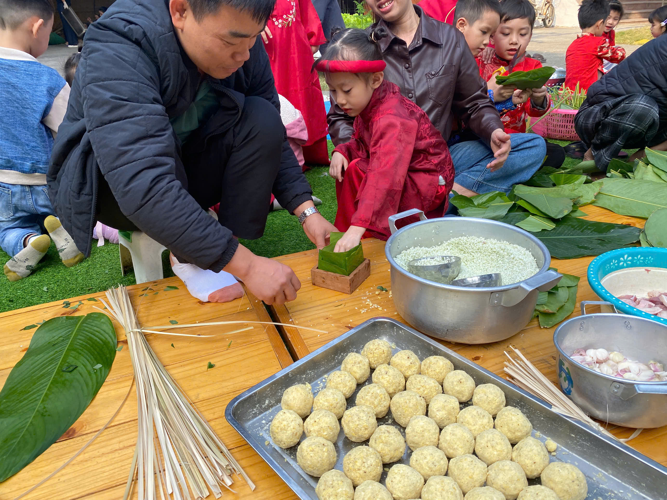 Ngày thứ hai, hoạt động trải nghiệm “Gói bánh chưng xanh” tiếp tục mang đến nhiều cảm xúc ấm áp và đáng nhớ. Dưới sự hướng dẫn ân cần của các cô giáo, cùng sự đồng hành của phụ huynh, các bé được tìm hiểu về ý nghĩa của bánh chưng – biểu tượng không thể thiếu trong ngày Tết cổ truyền của dân tộc Việt Nam. Từ việc làm quen với lá dong, gạo nếp, đỗ xanh, đến những thao tác gói bánh đầu đời, dù còn vụng về nhưng các bé đều vô cùng hào hứng, tự hào khi được trực tiếp tham gia. Những chiếc bánh chưng xanh được gói không chỉ chứa đựng nguyên liệu của Tết mà còn gói trọn yêu thương, sự sẻ chia và những bài học đầu đời về truyền thống quê hương.