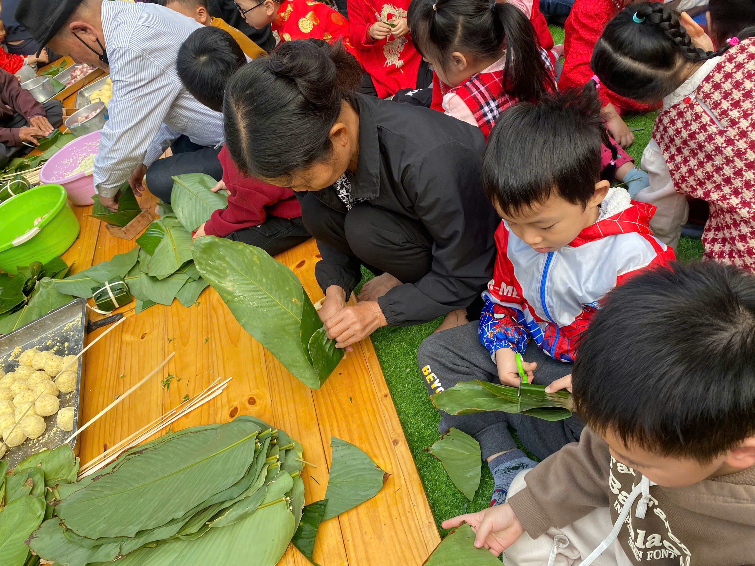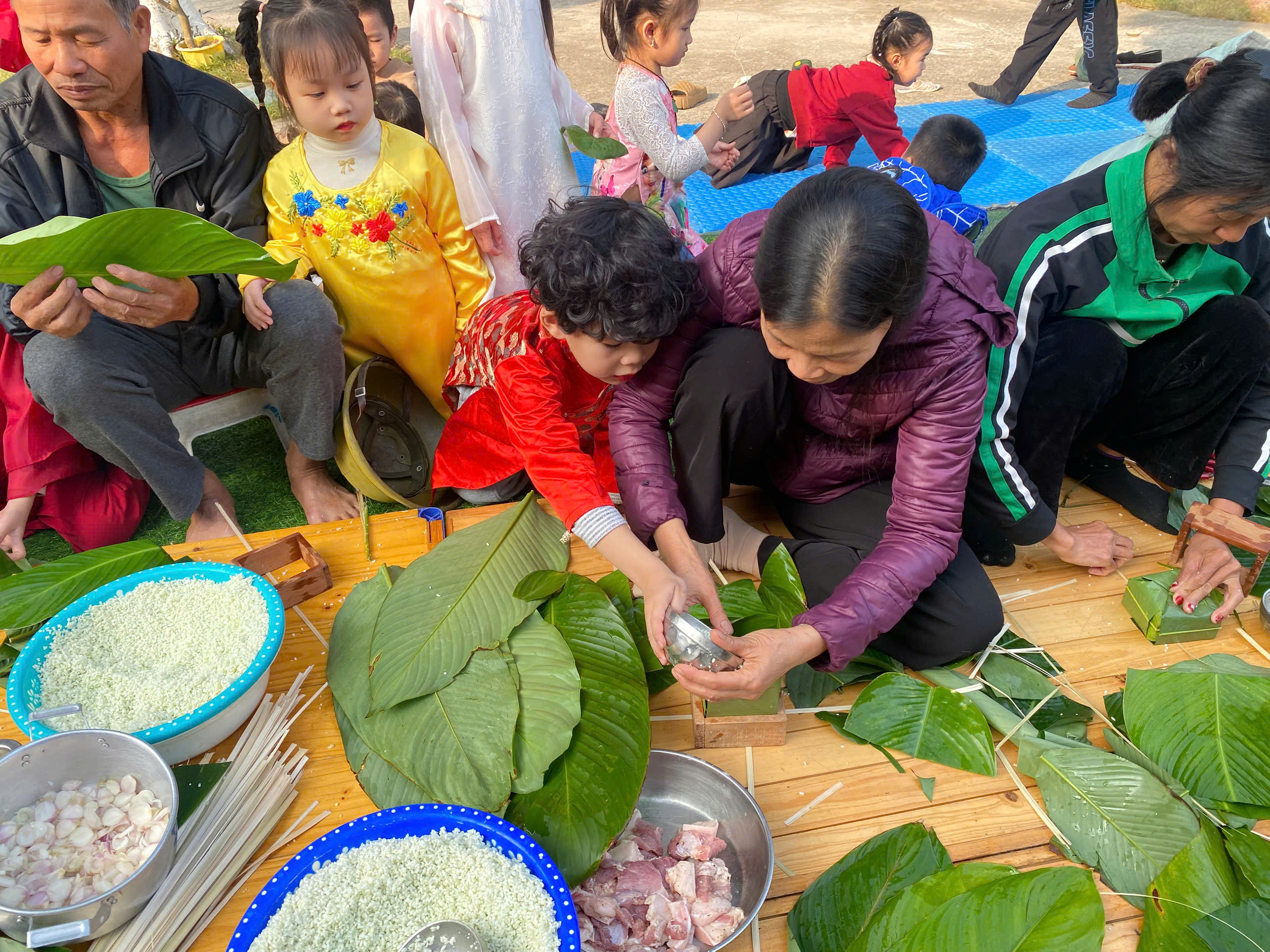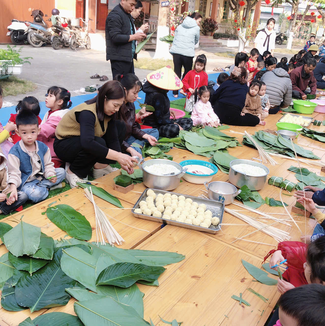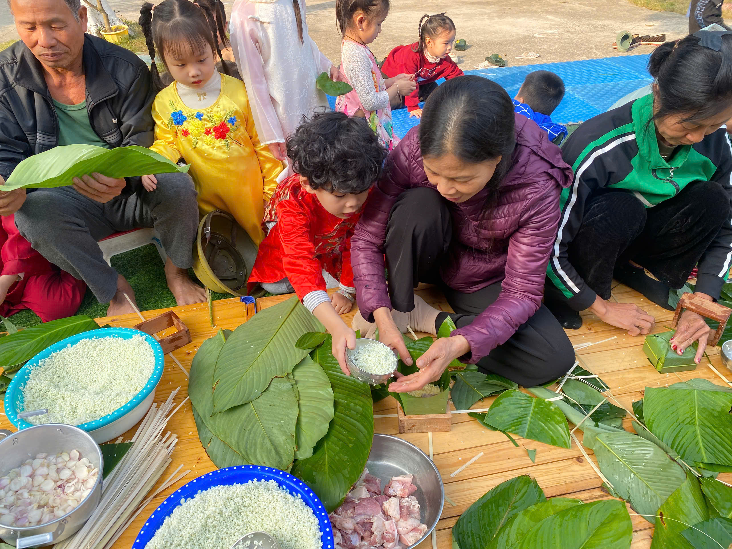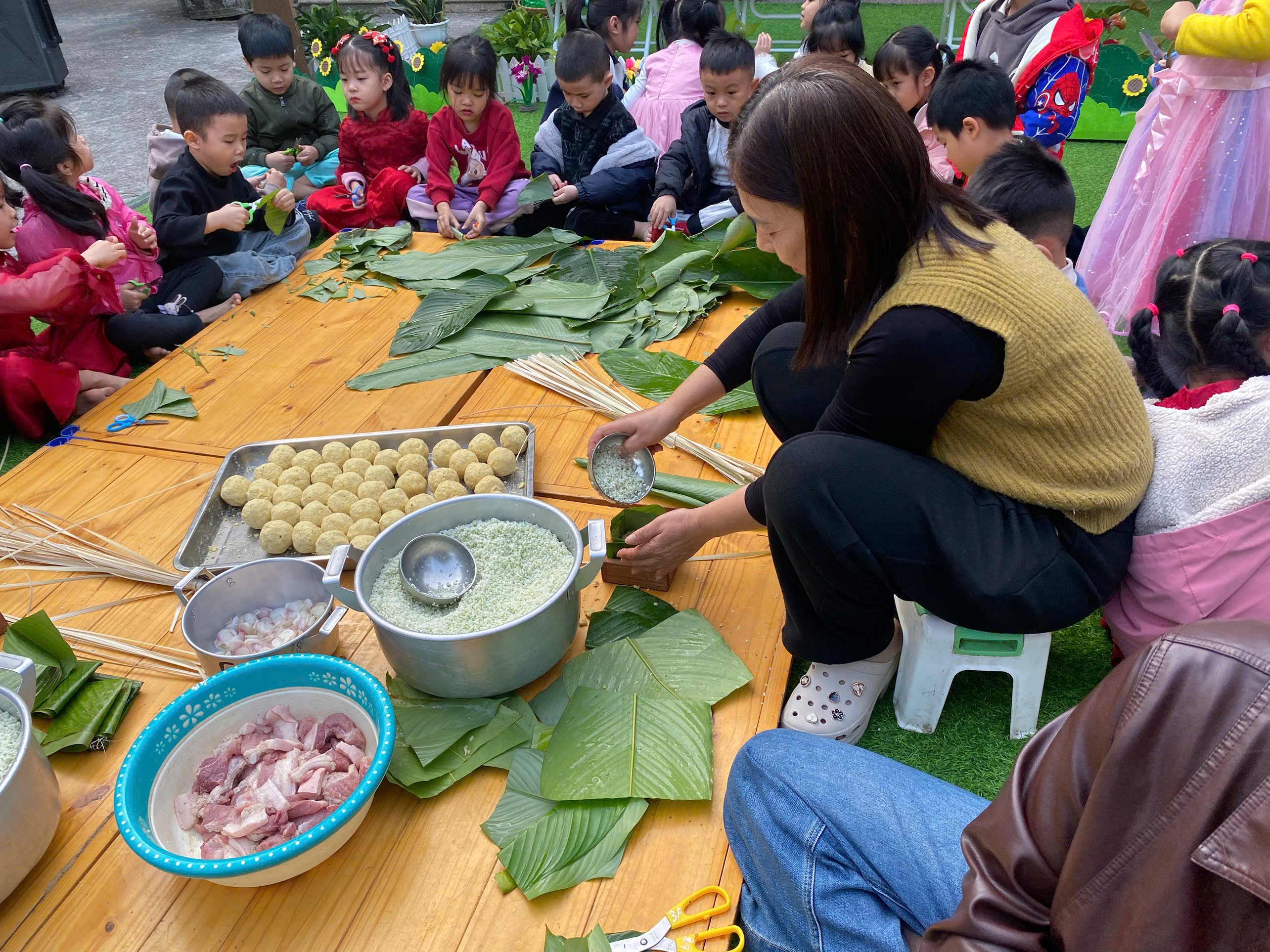 Ngày thứ hai, hoạt động trải nghiệm “Gói bánh chưng xanh” tiếp tục mang đến nhiều cảm xúc ấm áp và đáng nhớ. Dưới sự hướng dẫn ân cần của các cô giáo, cùng sự đồng hành của phụ huynh, các bé được tìm hiểu về ý nghĩa của bánh chưng – biểu tượng không thể thiếu trong ngày Tết cổ truyền của dân tộc Việt Nam. Từ việc làm quen với lá dong, gạo nếp, đỗ xanh, đến những thao tác gói bánh đầu đời, dù còn vụng về nhưng các bé đều vô cùng hào hứng, tự hào khi được trực tiếp tham gia. Những chiếc bánh chưng xanh được gói không chỉ chứa đựng nguyên liệu của Tết mà còn gói trọn yêu thương, sự sẻ chia và những bài học đầu đời về truyền thống quê hương.