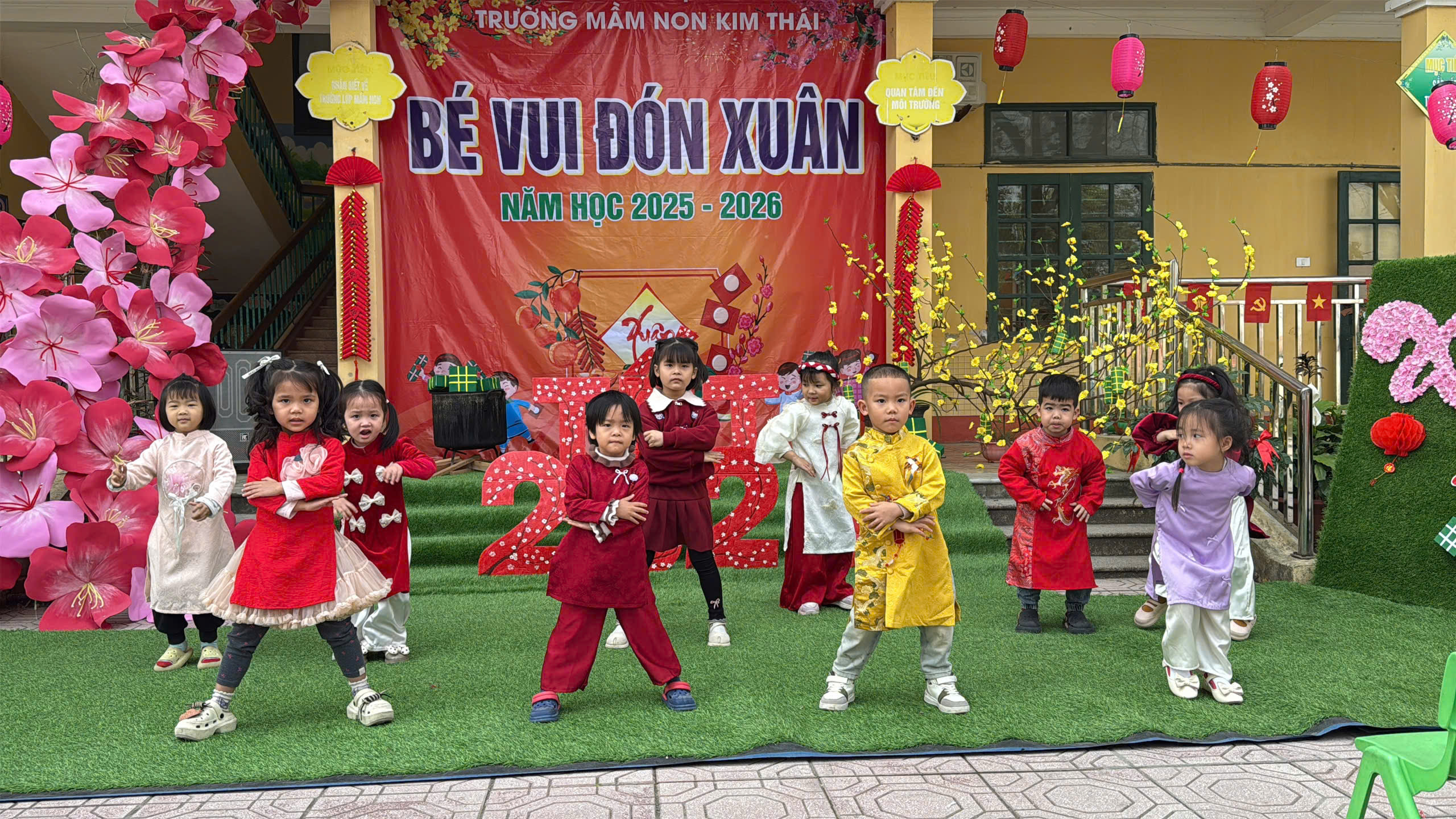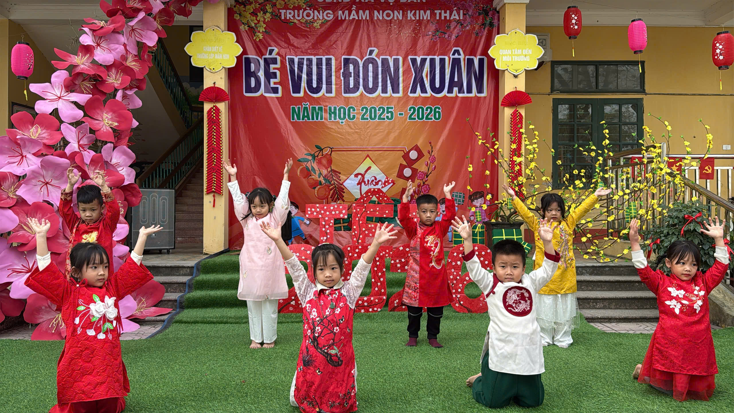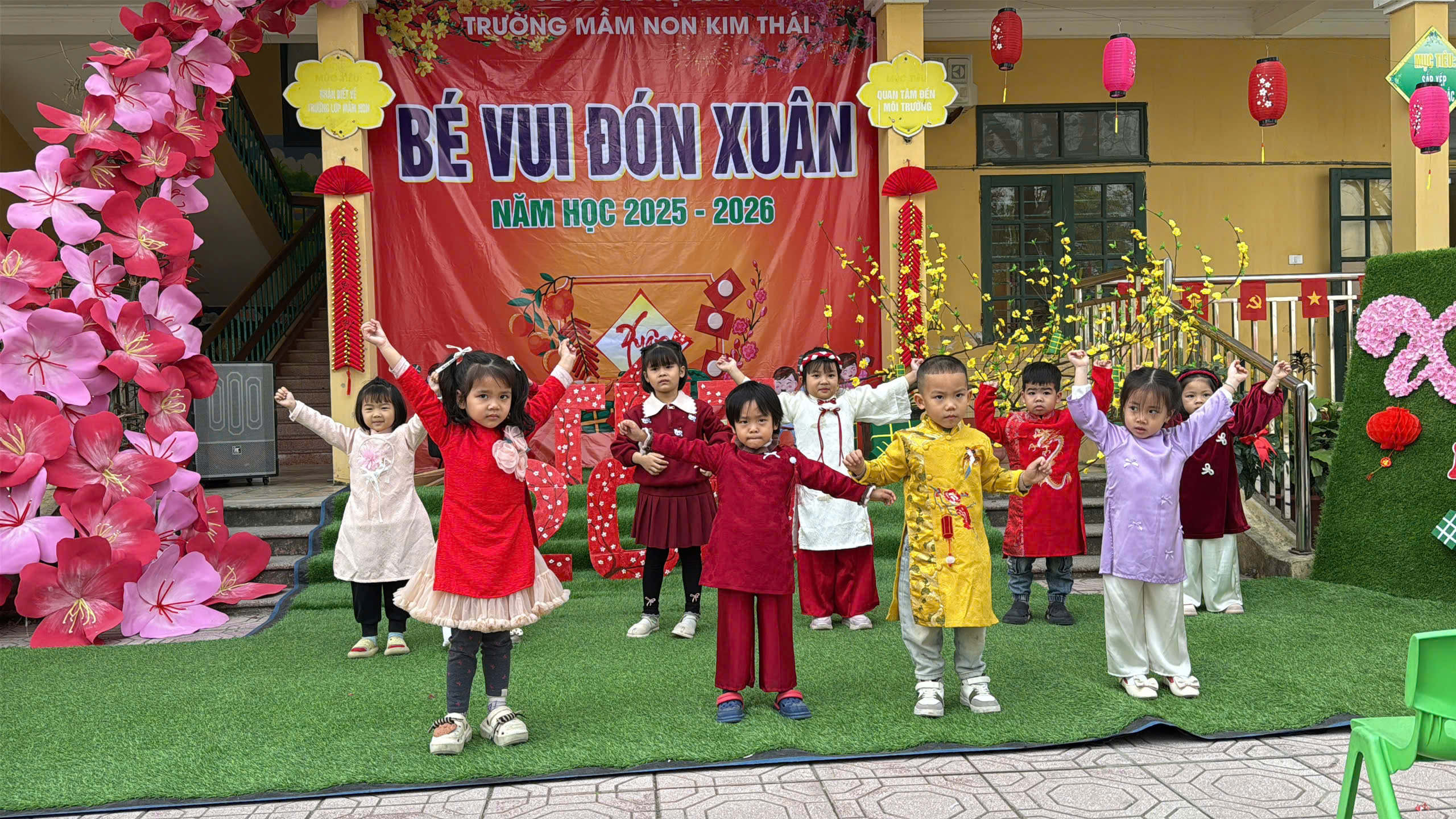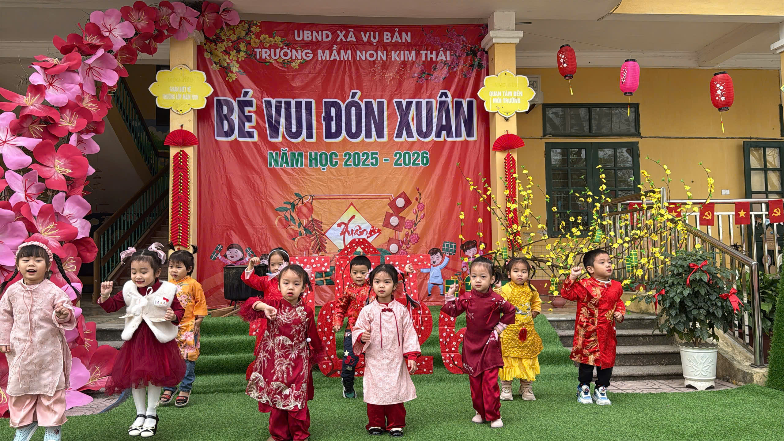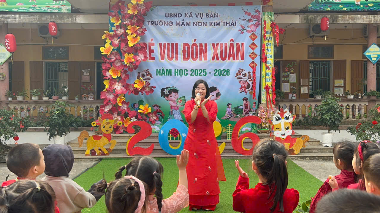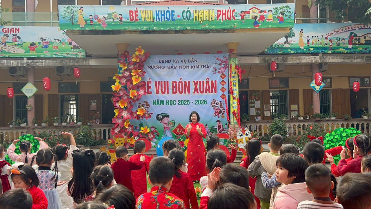 Những ngày cận kề Tết Nguyên đán, Trường Mầm non Kim Thái như khoác lên mình chiếc áo mới rực rỡ sắc xuân. Từ cổng trường đến từng góc sân, hành lang lớp học đều được trang trí ngập tràn hoa đào, hoa mai, câu đối đỏ, đèn lồng… tạo nên không gian ấm áp, tươi vui, mang đậm hương vị Tết cổ truyền. Tiếng cười nói rộn ràng, ánh mắt háo hức của trẻ thơ khiến sân trường những ngày này trở nên nhộn nhịp và tràn đầy sức sống hơn bao giờ hết.