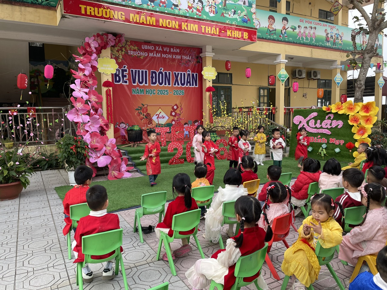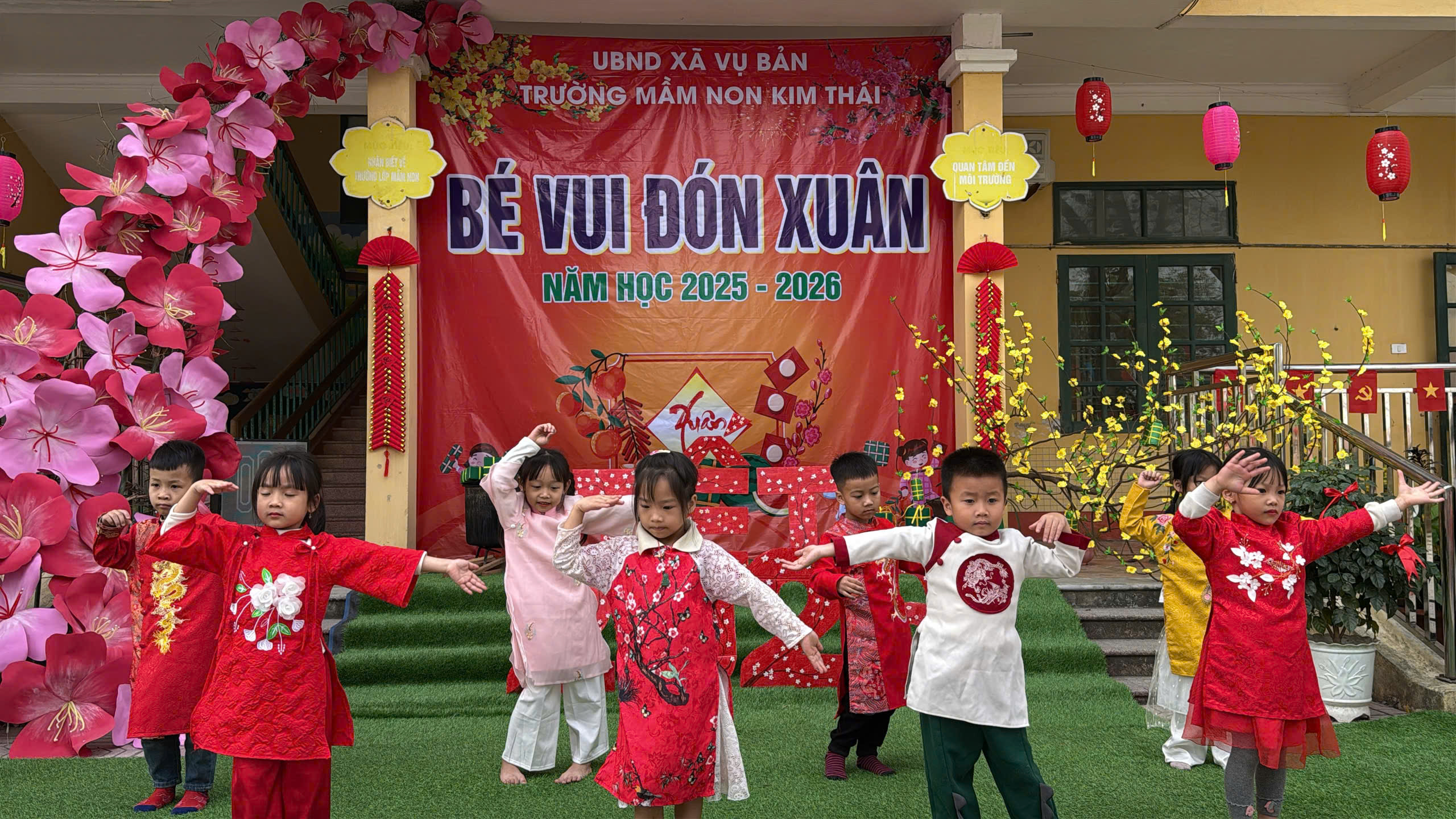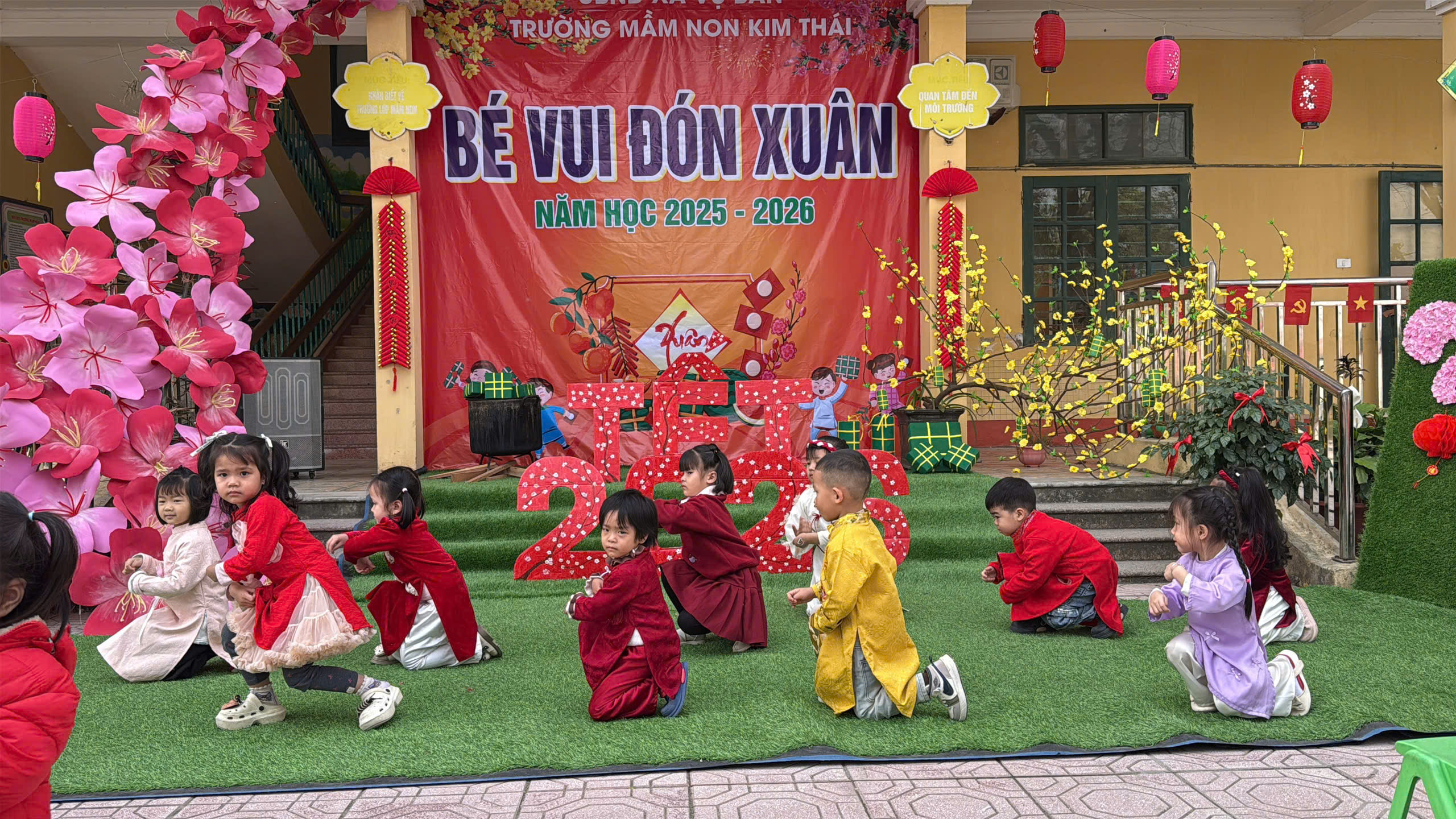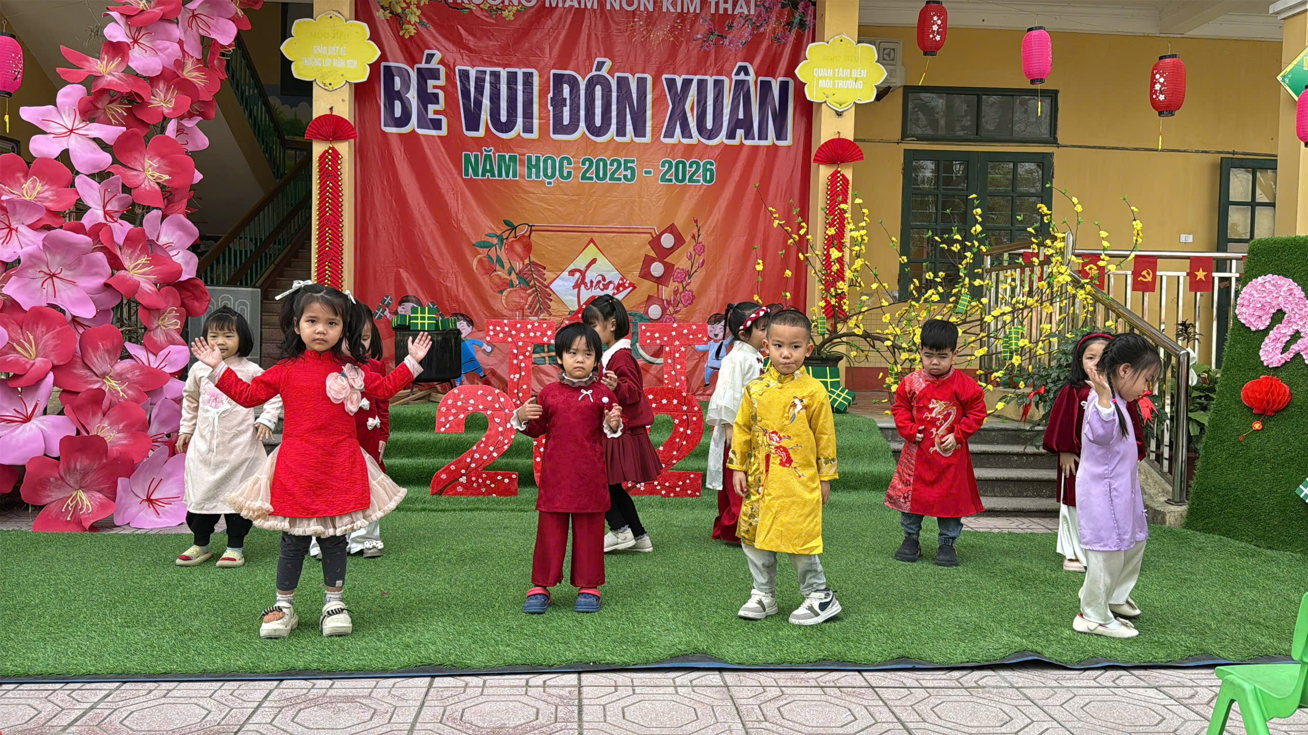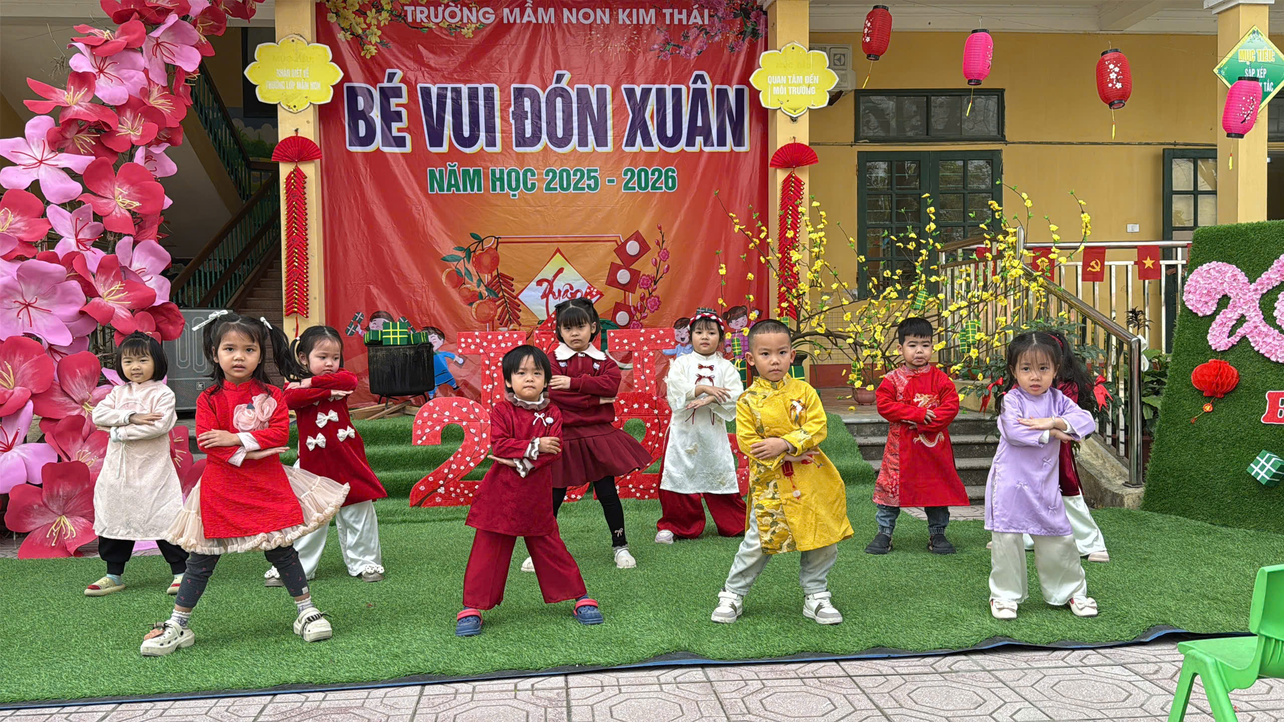 Những ngày cận kề Tết Nguyên đán, Trường Mầm non Kim Thái như khoác lên mình chiếc áo mới rực rỡ sắc xuân. Từ cổng trường đến từng góc sân, hành lang lớp học đều được trang trí ngập tràn hoa đào, hoa mai, câu đối đỏ, đèn lồng… tạo nên không gian ấm áp, tươi vui, mang đậm hương vị Tết cổ truyền. Tiếng cười nói rộn ràng, ánh mắt háo hức của trẻ thơ khiến sân trường những ngày này trở nên nhộn nhịp và tràn đầy sức sống hơn bao giờ hết.