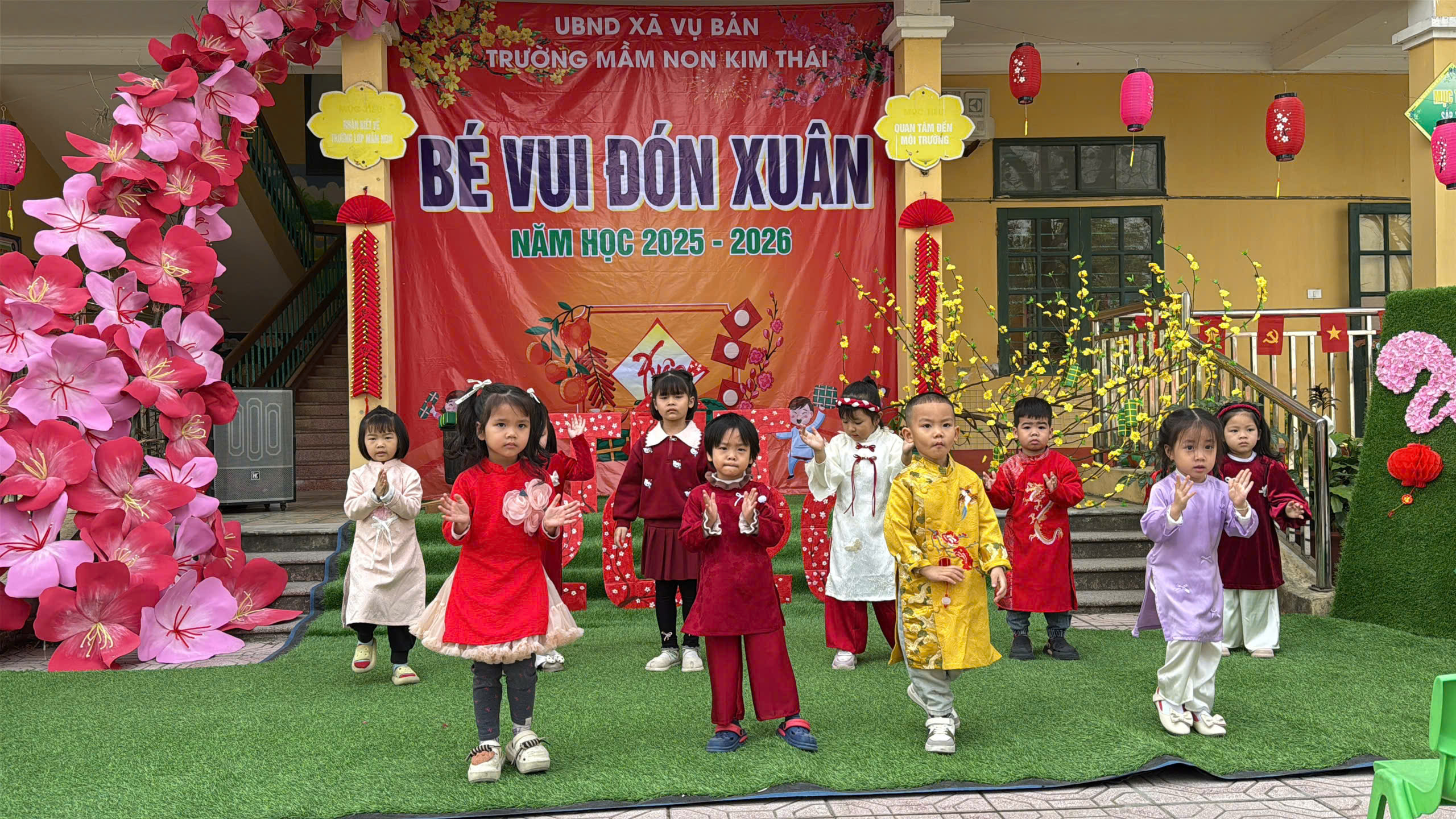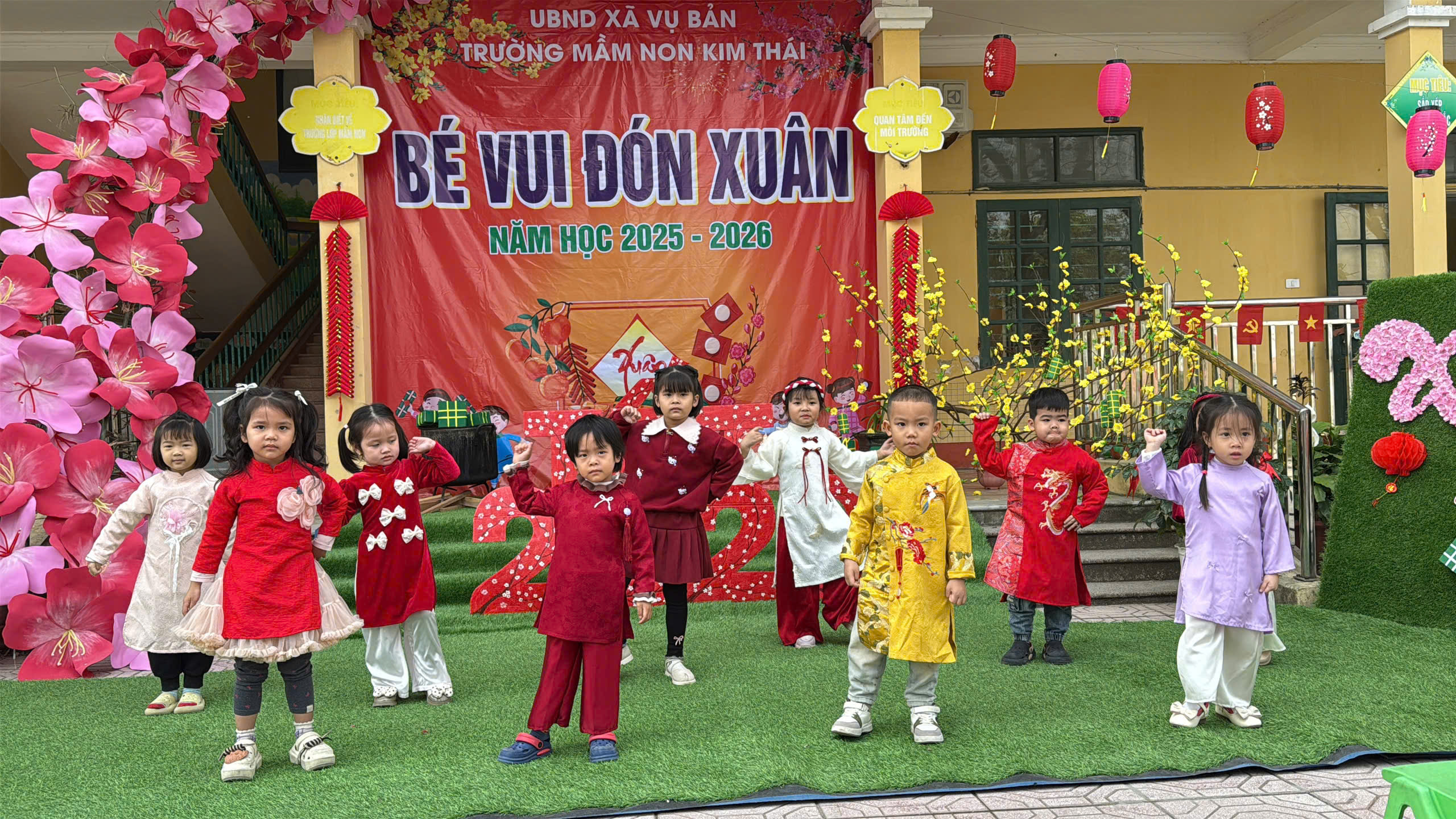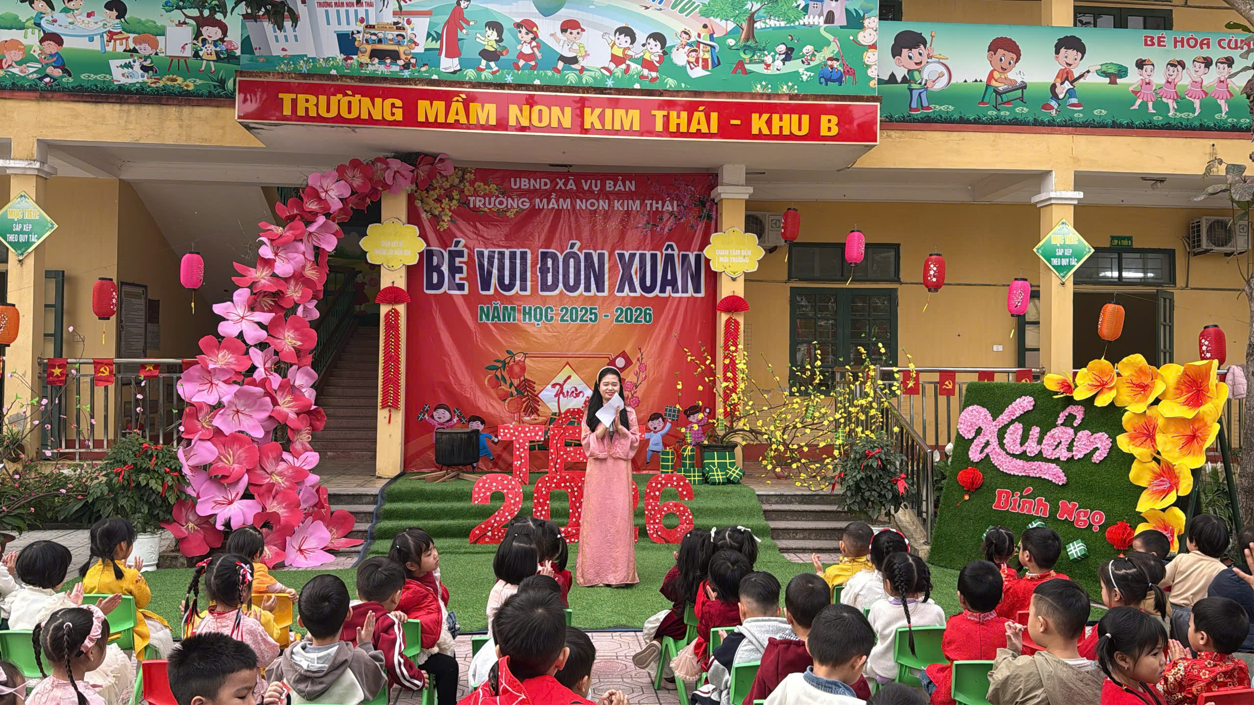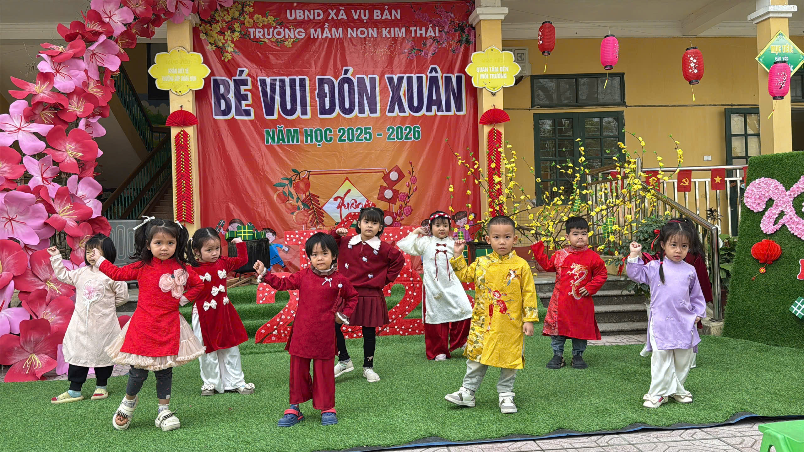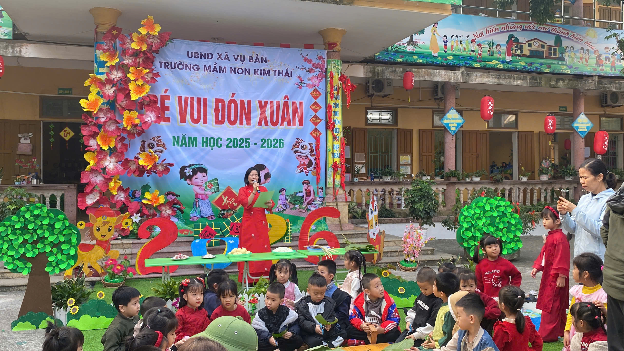 Những ngày cận kề Tết Nguyên đán, Trường Mầm non Kim Thái như khoác lên mình chiếc áo mới rực rỡ sắc xuân. Từ cổng trường đến từng góc sân, hành lang lớp học đều được trang trí ngập tràn hoa đào, hoa mai, câu đối đỏ, đèn lồng… tạo nên không gian ấm áp, tươi vui, mang đậm hương vị Tết cổ truyền. Tiếng cười nói rộn ràng, ánh mắt háo hức của trẻ thơ khiến sân trường những ngày này trở nên nhộn nhịp và tràn đầy sức sống hơn bao giờ hết.
