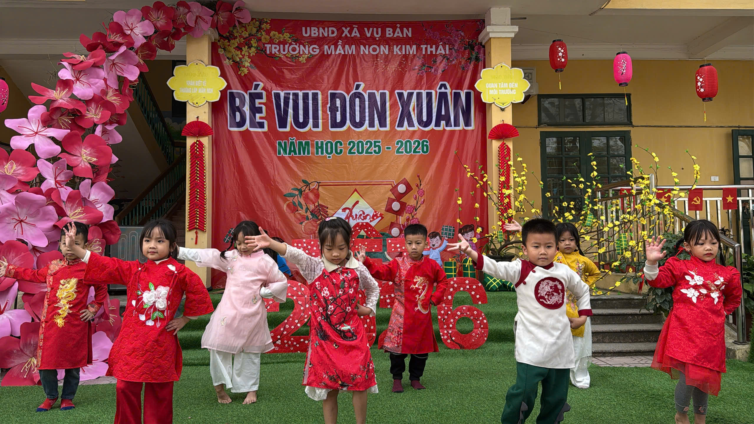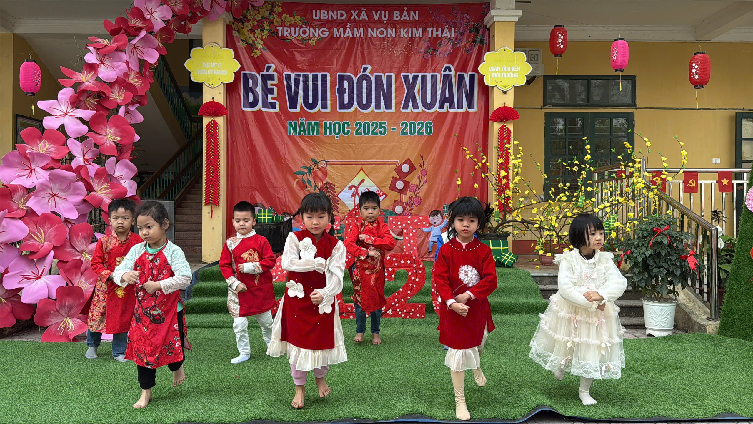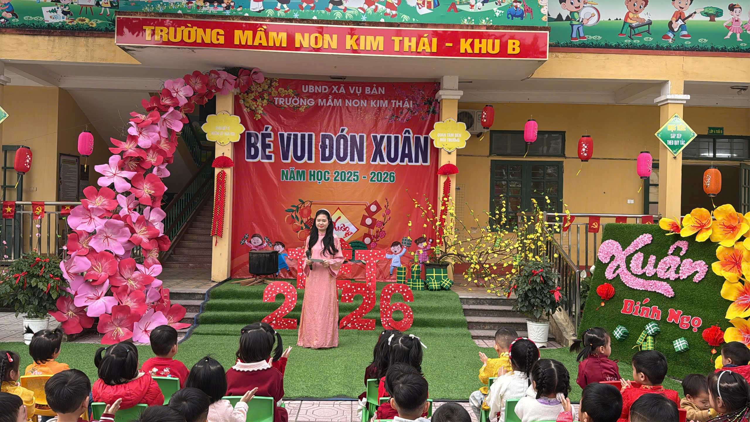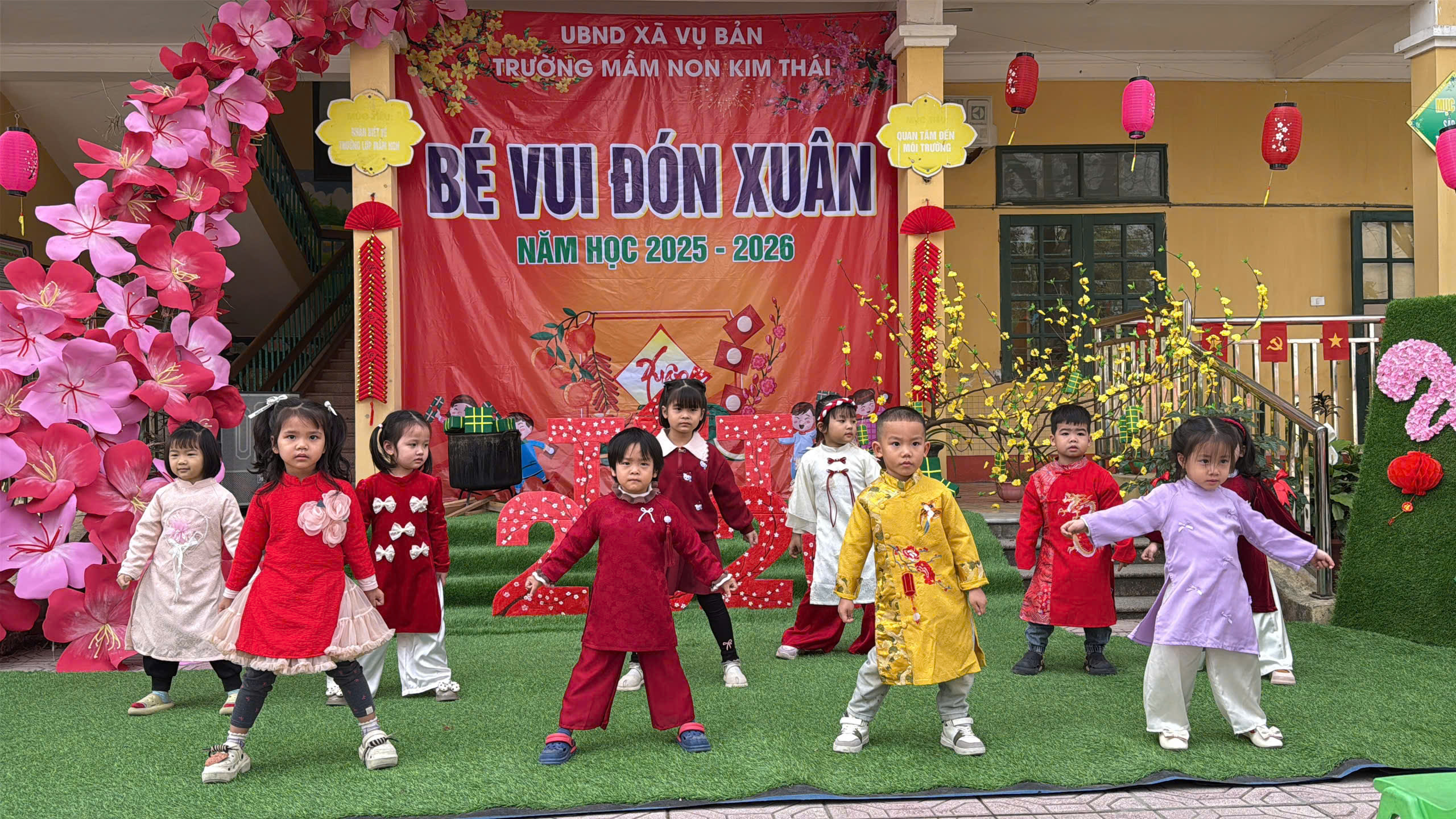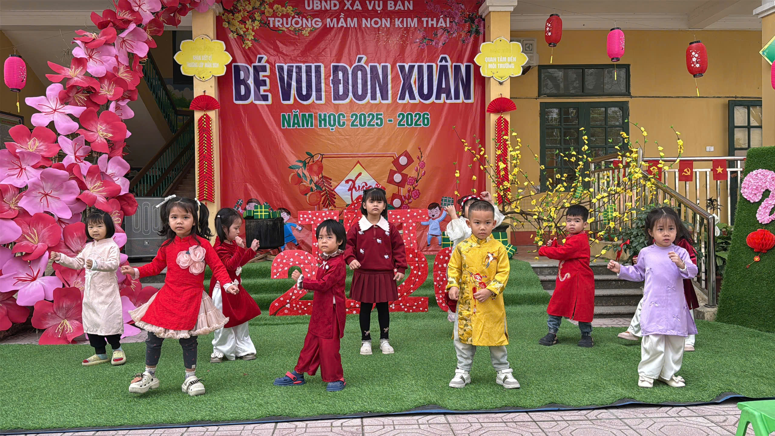 Những ngày cận kề Tết Nguyên đán, Trường Mầm non Kim Thái như khoác lên mình chiếc áo mới rực rỡ sắc xuân. Từ cổng trường đến từng góc sân, hành lang lớp học đều được trang trí ngập tràn hoa đào, hoa mai, câu đối đỏ, đèn lồng… tạo nên không gian ấm áp, tươi vui, mang đậm hương vị Tết cổ truyền. Tiếng cười nói rộn ràng, ánh mắt háo hức của trẻ thơ khiến sân trường những ngày này trở nên nhộn nhịp và tràn đầy sức sống hơn bao giờ hết.