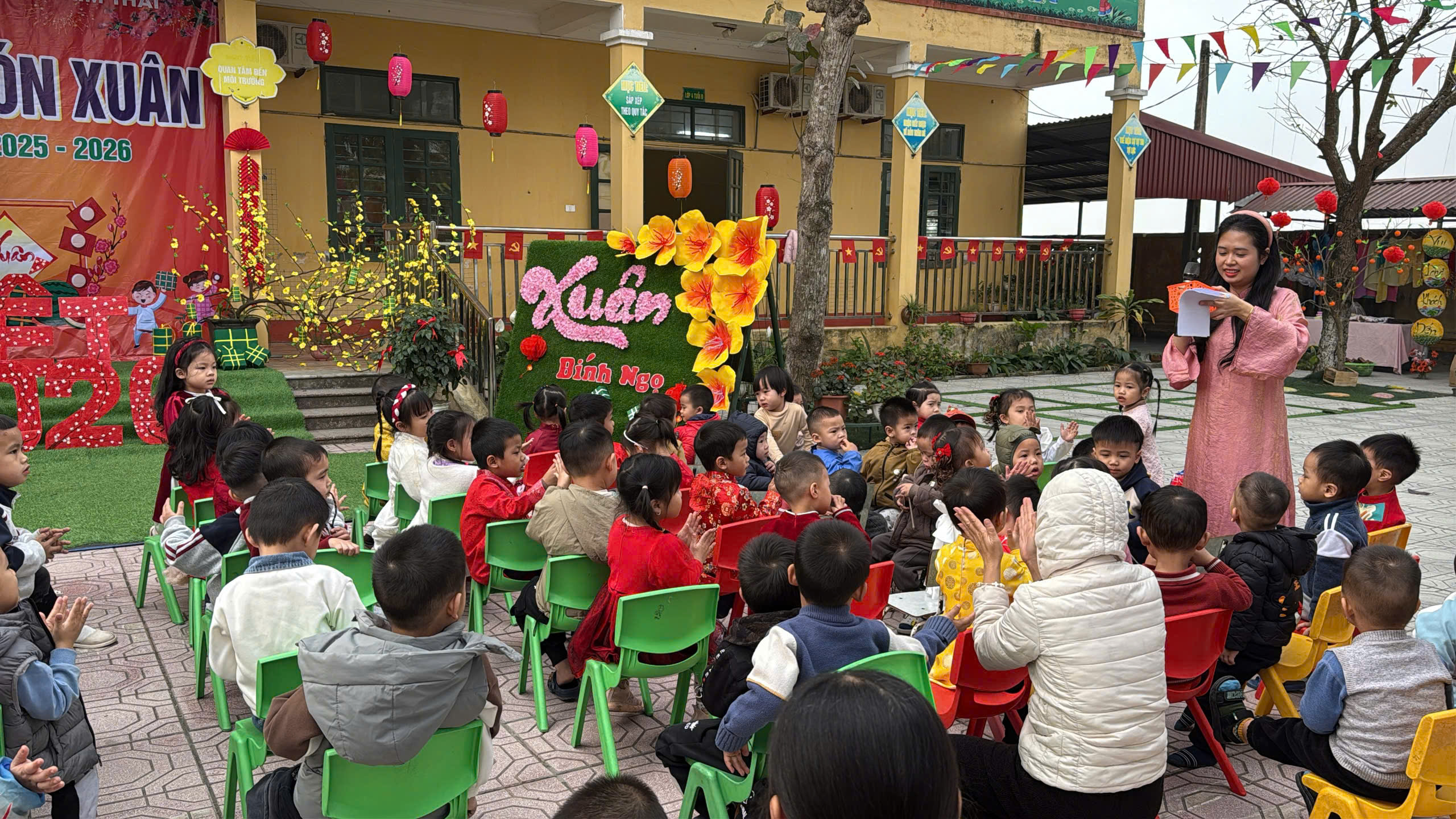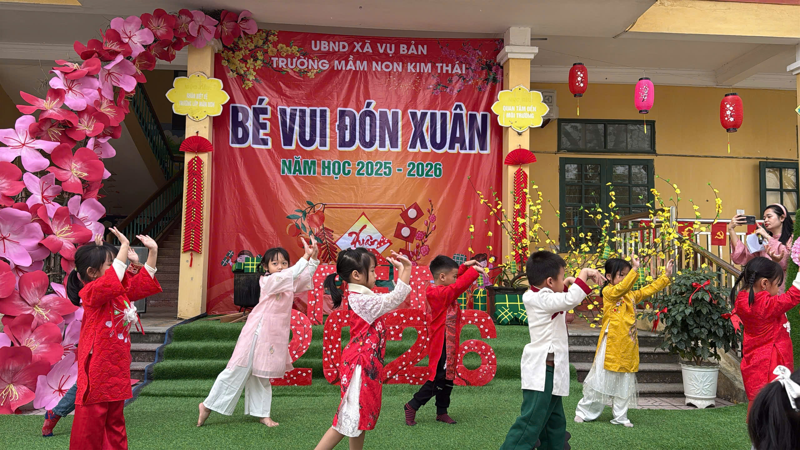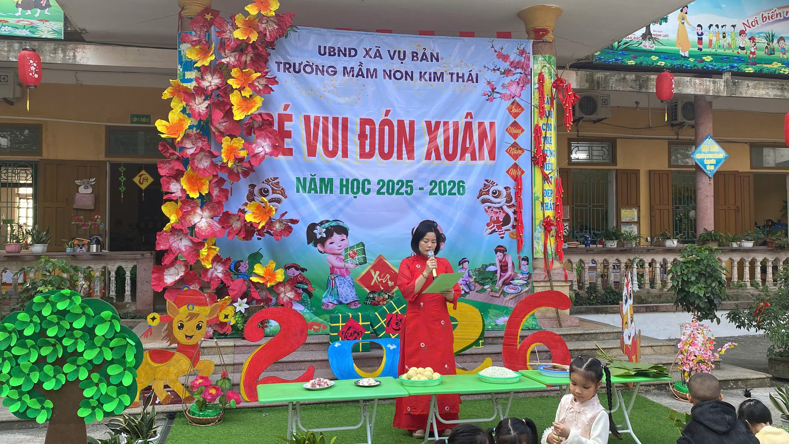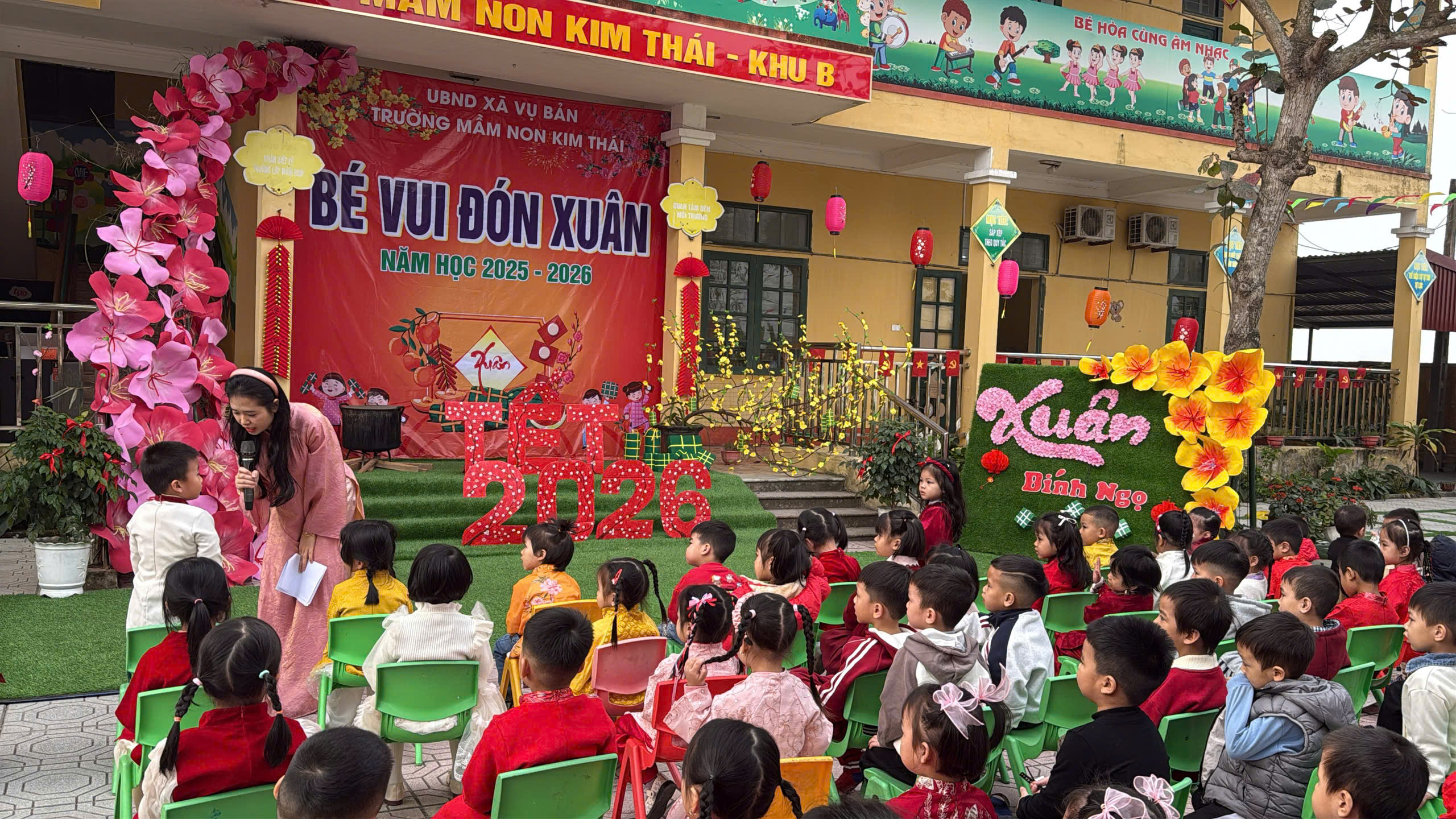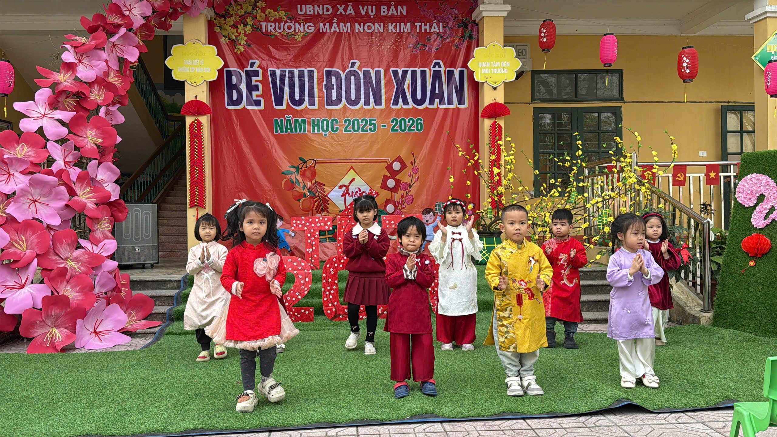 Những ngày cận kề Tết Nguyên đán, Trường Mầm non Kim Thái như khoác lên mình chiếc áo mới rực rỡ sắc xuân. Từ cổng trường đến từng góc sân, hành lang lớp học đều được trang trí ngập tràn hoa đào, hoa mai, câu đối đỏ, đèn lồng… tạo nên không gian ấm áp, tươi vui, mang đậm hương vị Tết cổ truyền. Tiếng cười nói rộn ràng, ánh mắt háo hức của trẻ thơ khiến sân trường những ngày này trở nên nhộn nhịp và tràn đầy sức sống hơn bao giờ hết.
