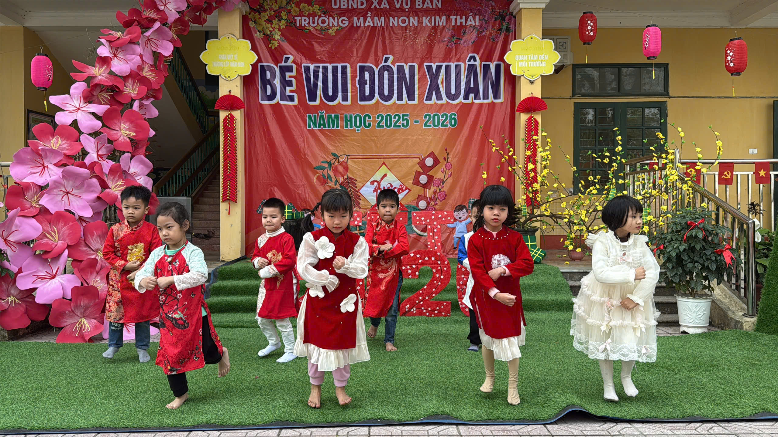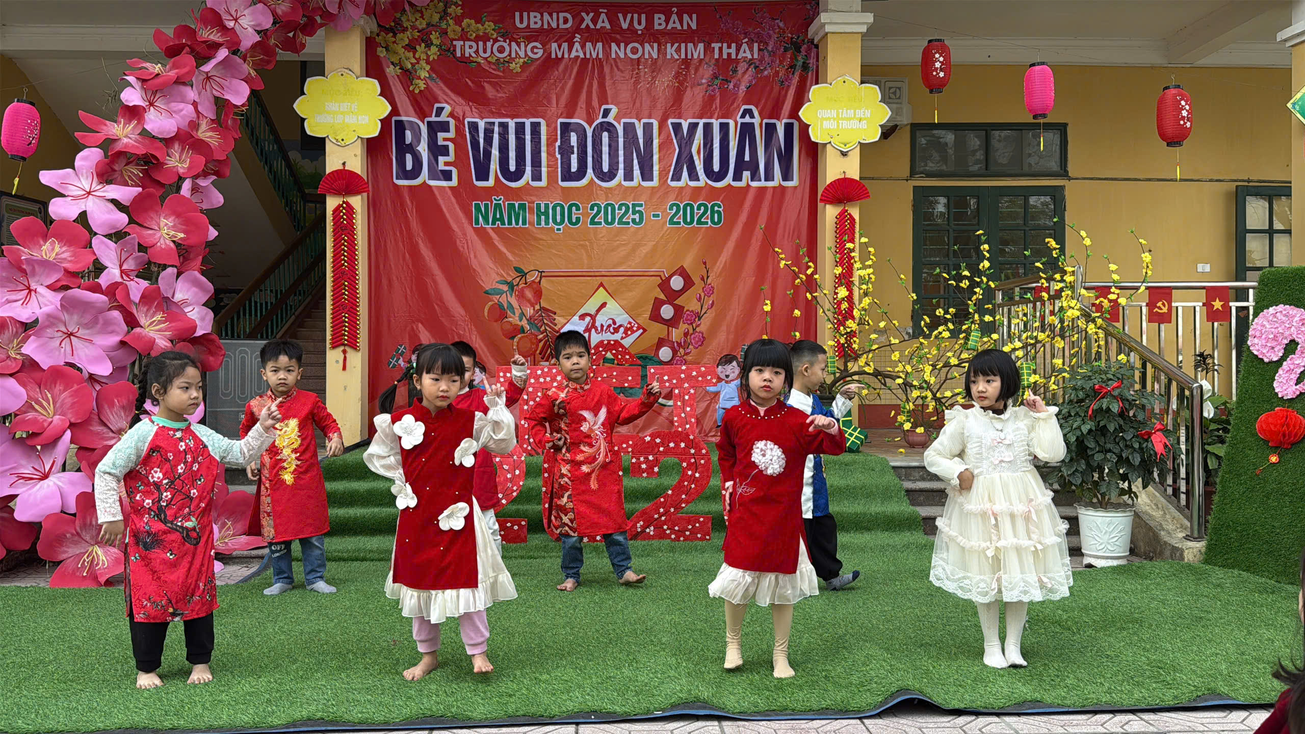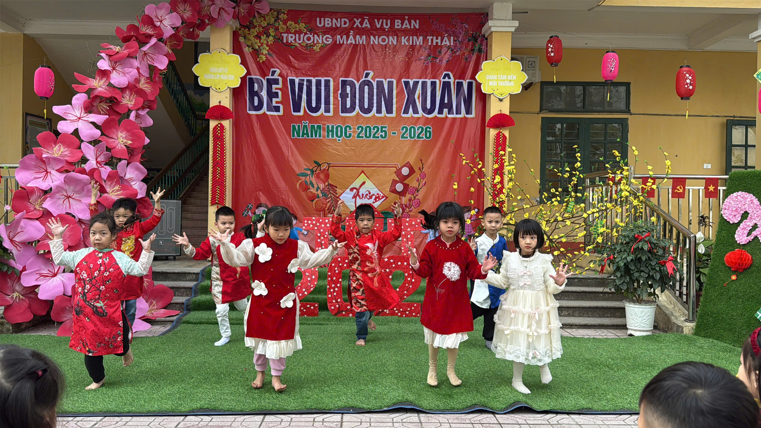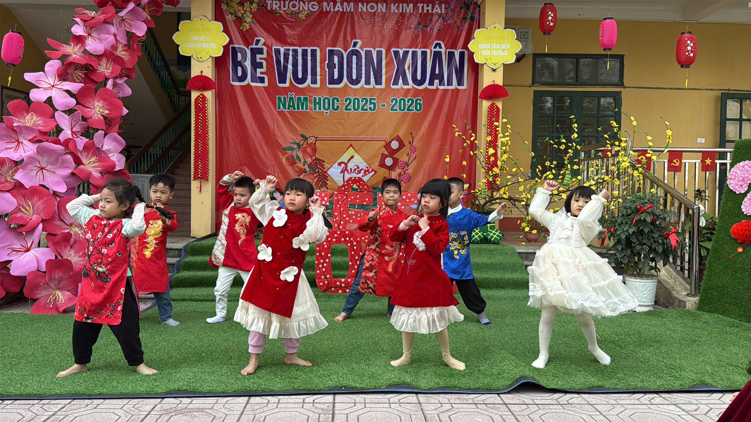 Ngày thứ nhất, sân trường Kim Thái rộn ràng trong không khí văn nghệ mừng xuân. Những tiết mục hát, múa ca ngợi mùa xuân, quê hương, đất nước được các bé thể hiện một cách hồn nhiên, tự tin và đầy cảm xúc. Trong những tà áo dài xinh xắn, những gương mặt rạng rỡ nụ cười, các bé đã mang đến một “bữa tiệc xuân” đầy màu sắc. Mỗi tiết mục không chỉ đem lại niềm vui mà còn là cơ hội để trẻ mạnh dạn thể hiện bản thân, phát triển năng khiếu nghệ thuật và cảm nhận trọn vẹn không khí Tết đang về rất gần.
