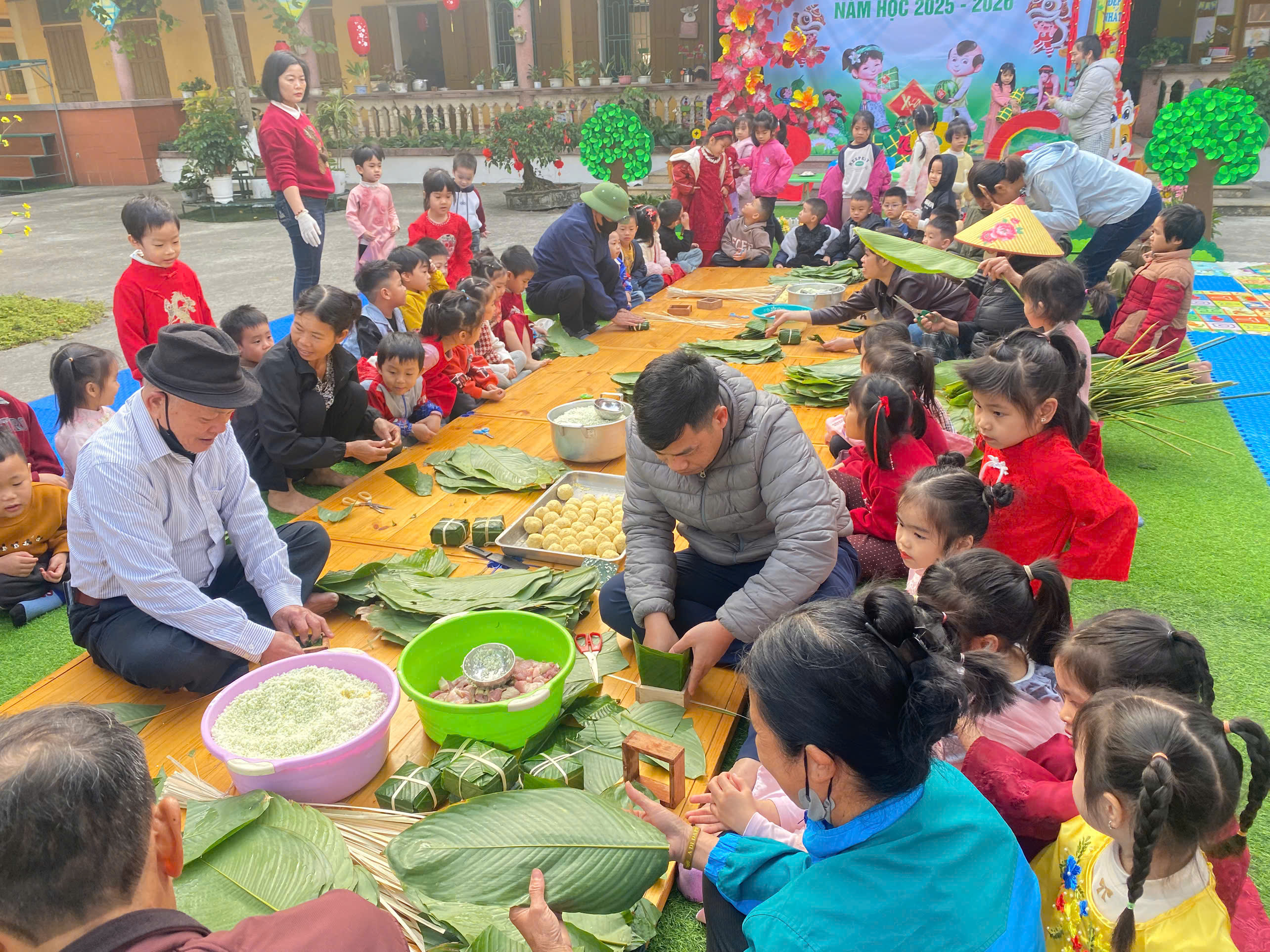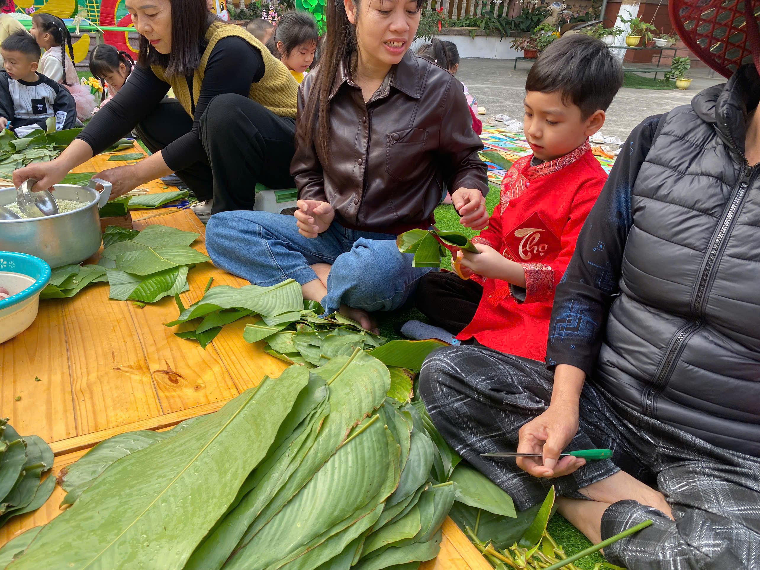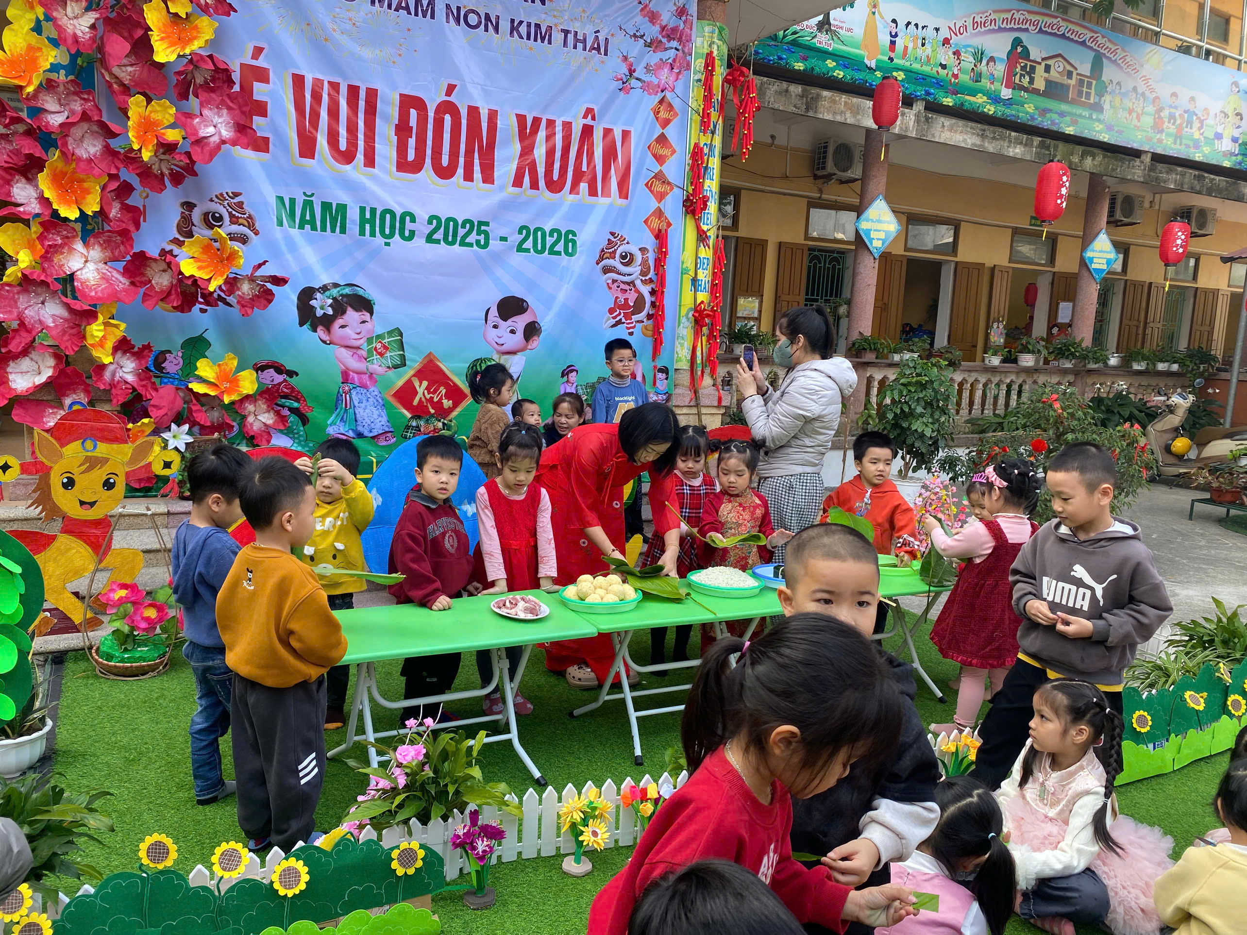 TRƯỜNG MẦM NON KIM THÁI TỔ CHỨC HOẠT ĐỘNG TRẢI NGHIỆM “BÉ VUI ĐÓN XUÂN – GÓI BÁNH CHƯNG XANH”